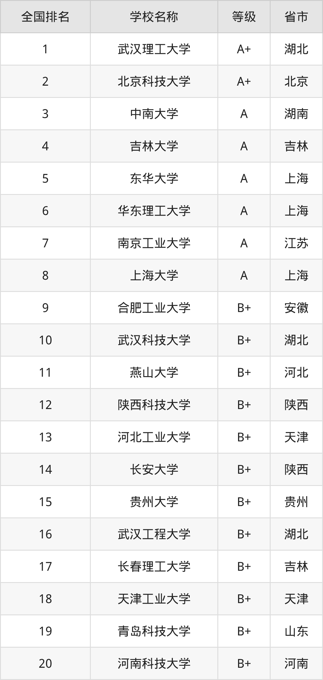 全国无机非金属材料工程开设院校参与排名的共有44所,实力最强的是武汉理工大学(全国排名第1名),其专业实力等级被评为A+级。