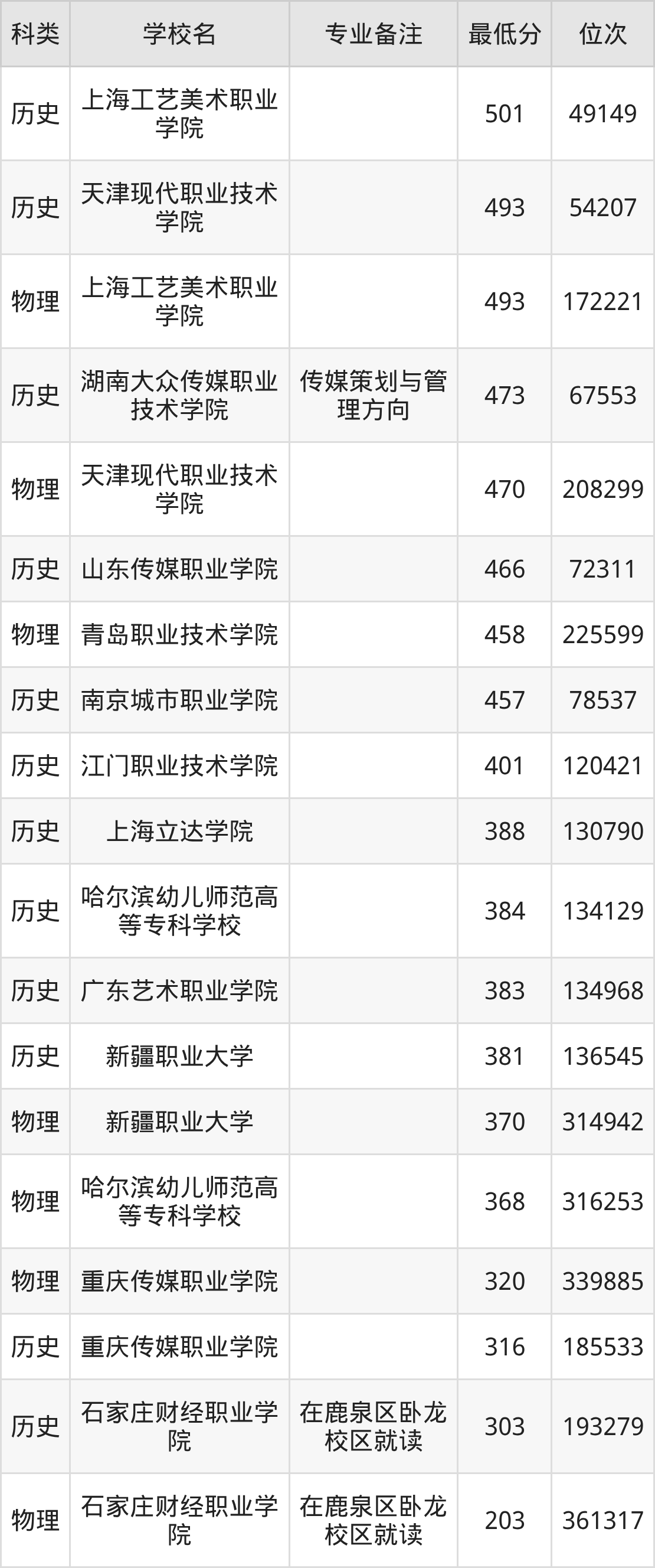 传播与策划专业分数最低的民办大学是石家庄财经职业学院,其2025年最低分为203分,考生只要超专科线3分即有概率能被录取。