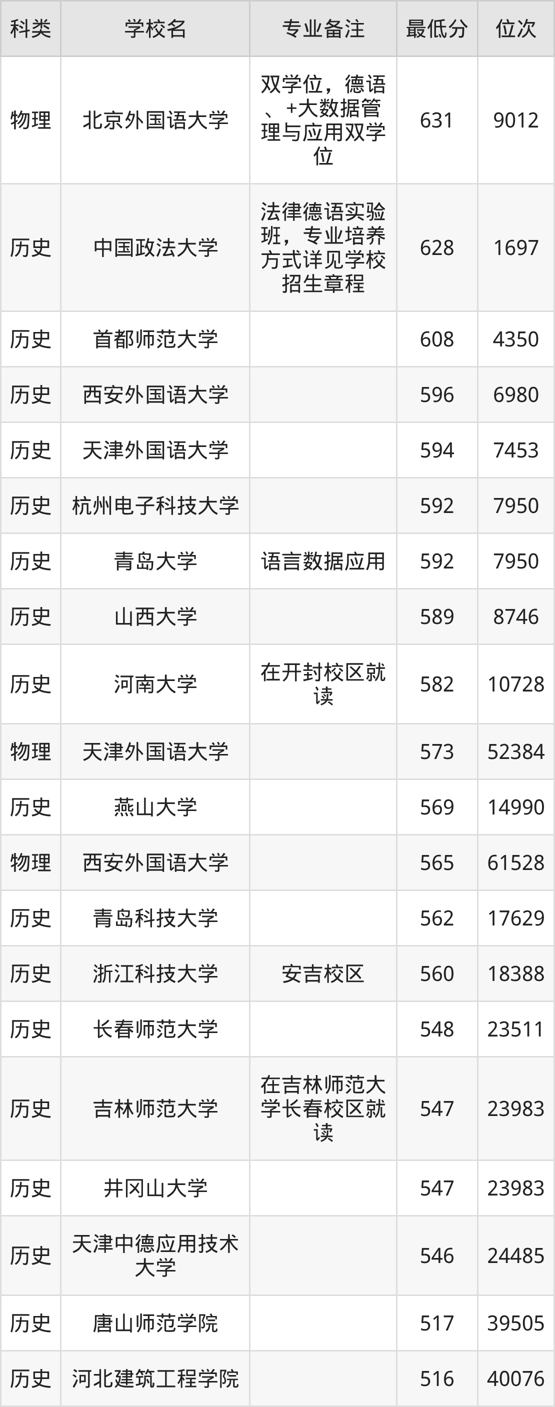 2025年全国大学德语录取分数线在466分~631分之间。数据显示,考生如果想报考公办大学,分数要在501分及以上,最低分院校有河北建筑工程学院等。