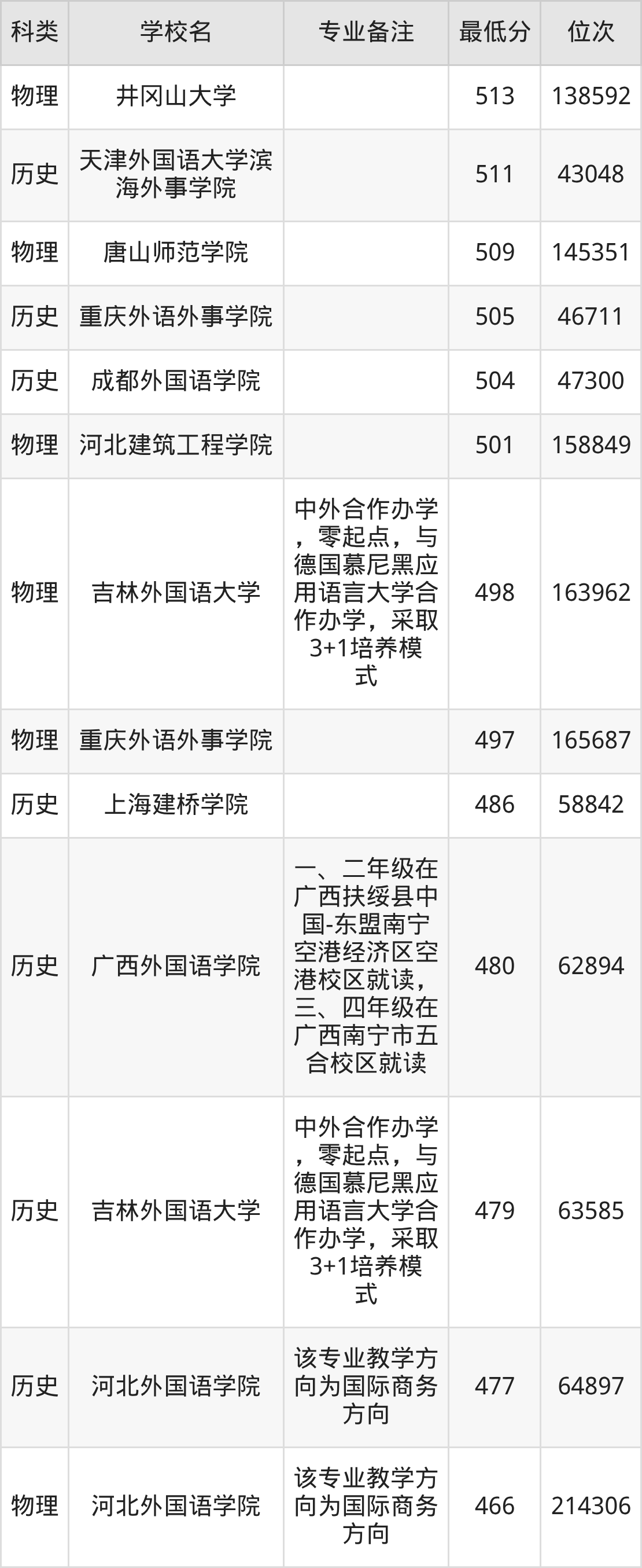 德语专业分数最低的民办大学是河北外国语学院,其2025年最低分为466分,考生只要超本科线7分即有概率能被录取。