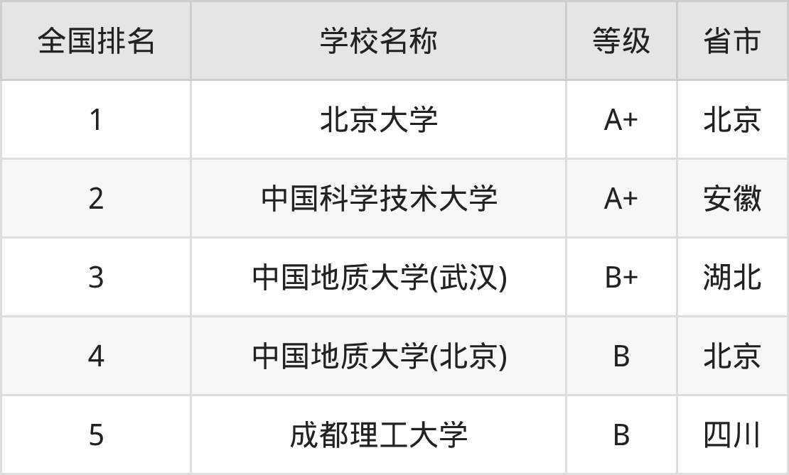 下面是地球化学专业全国排名前5的大学名单及实力评级: