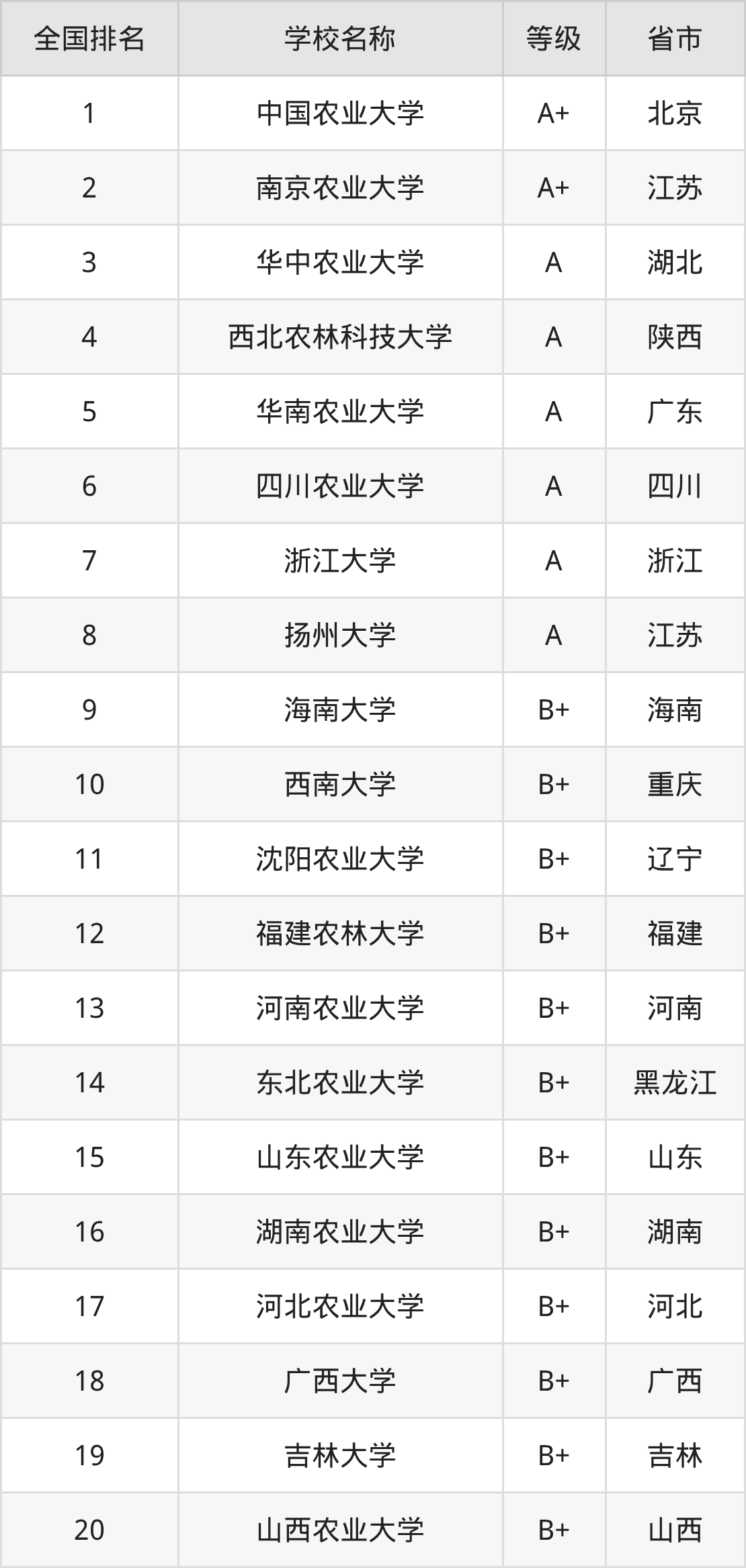 下面是农学专业全国排名前10的大学名单及实力评级:
