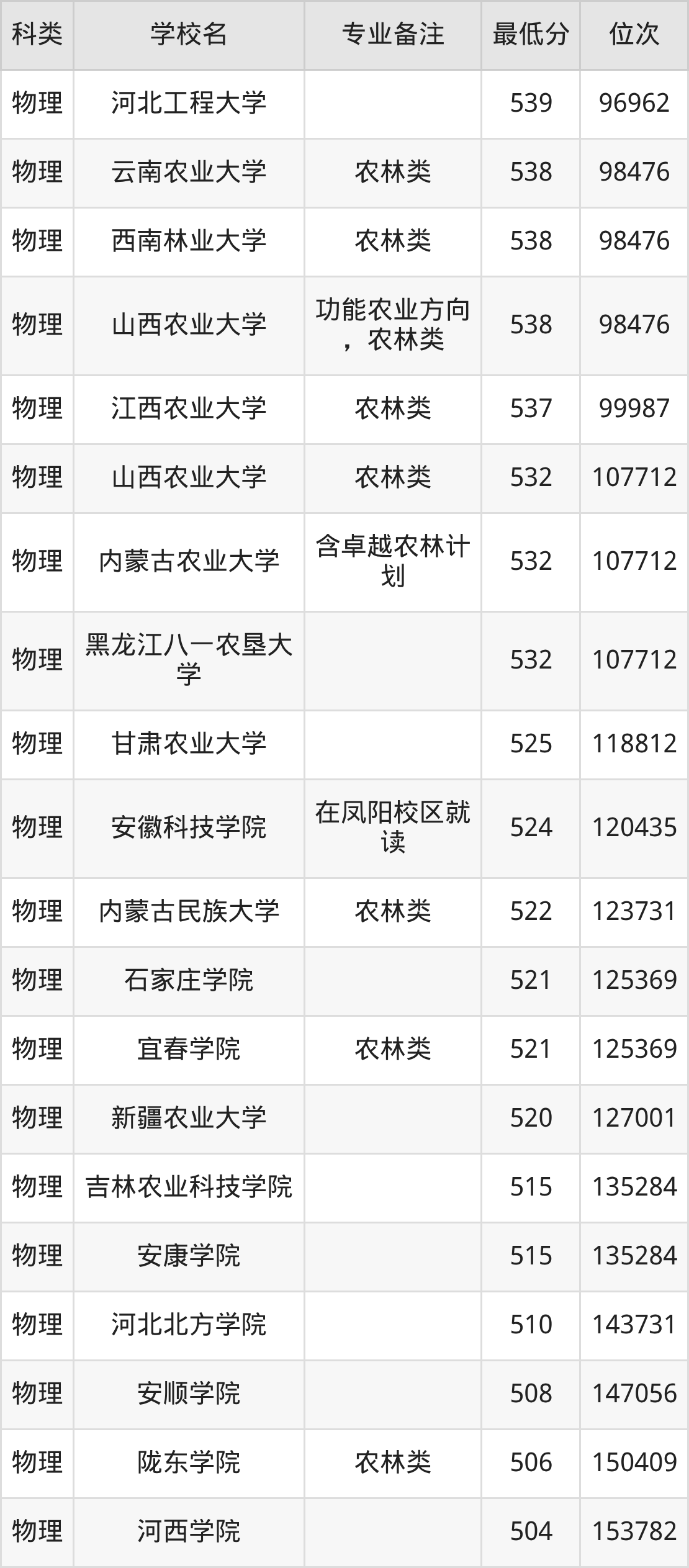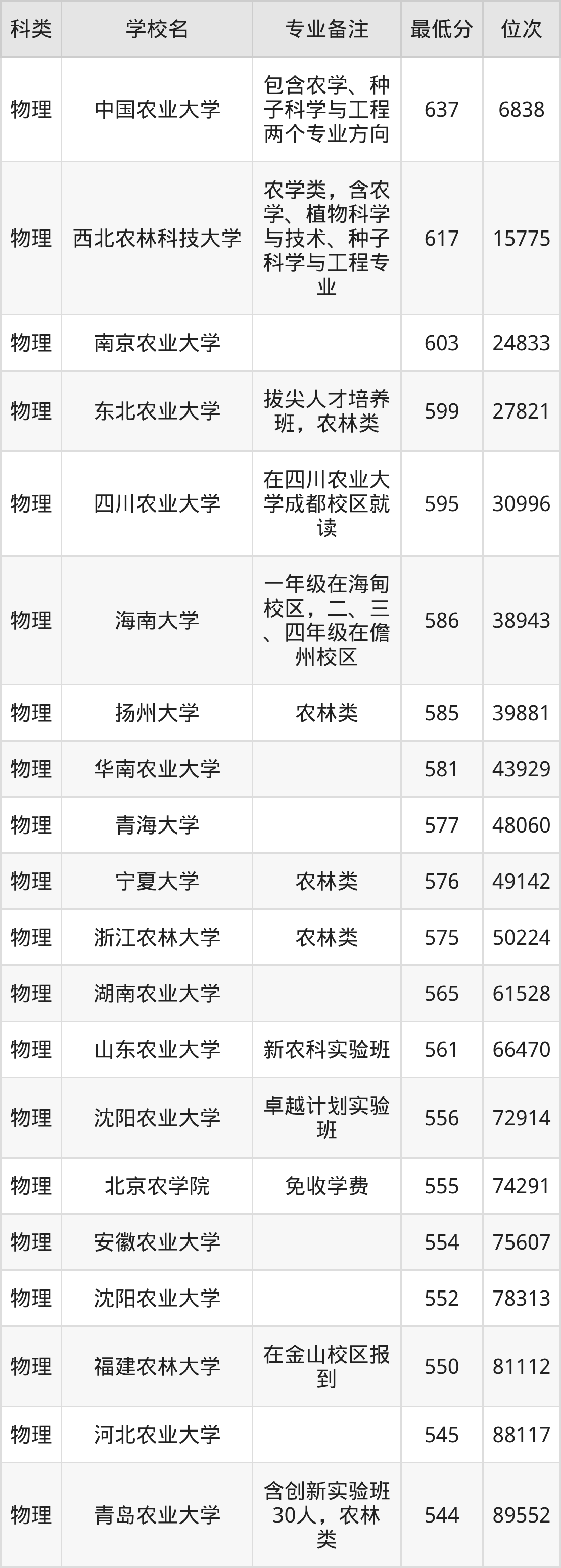 2025年全国大学农学录取分数线在496分~637分之间。数据显示,考生如果想报考公办大学,分数要在496分及以上,最低分院校有西藏农牧大学等。