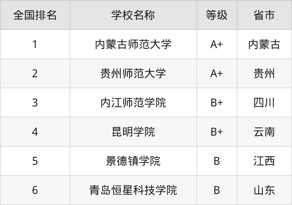 全国数字人文开设院校参与排名的共有6所,实力最强的是内蒙古师范大学(全国排名第1名),其专业实力等级被评为A+级。