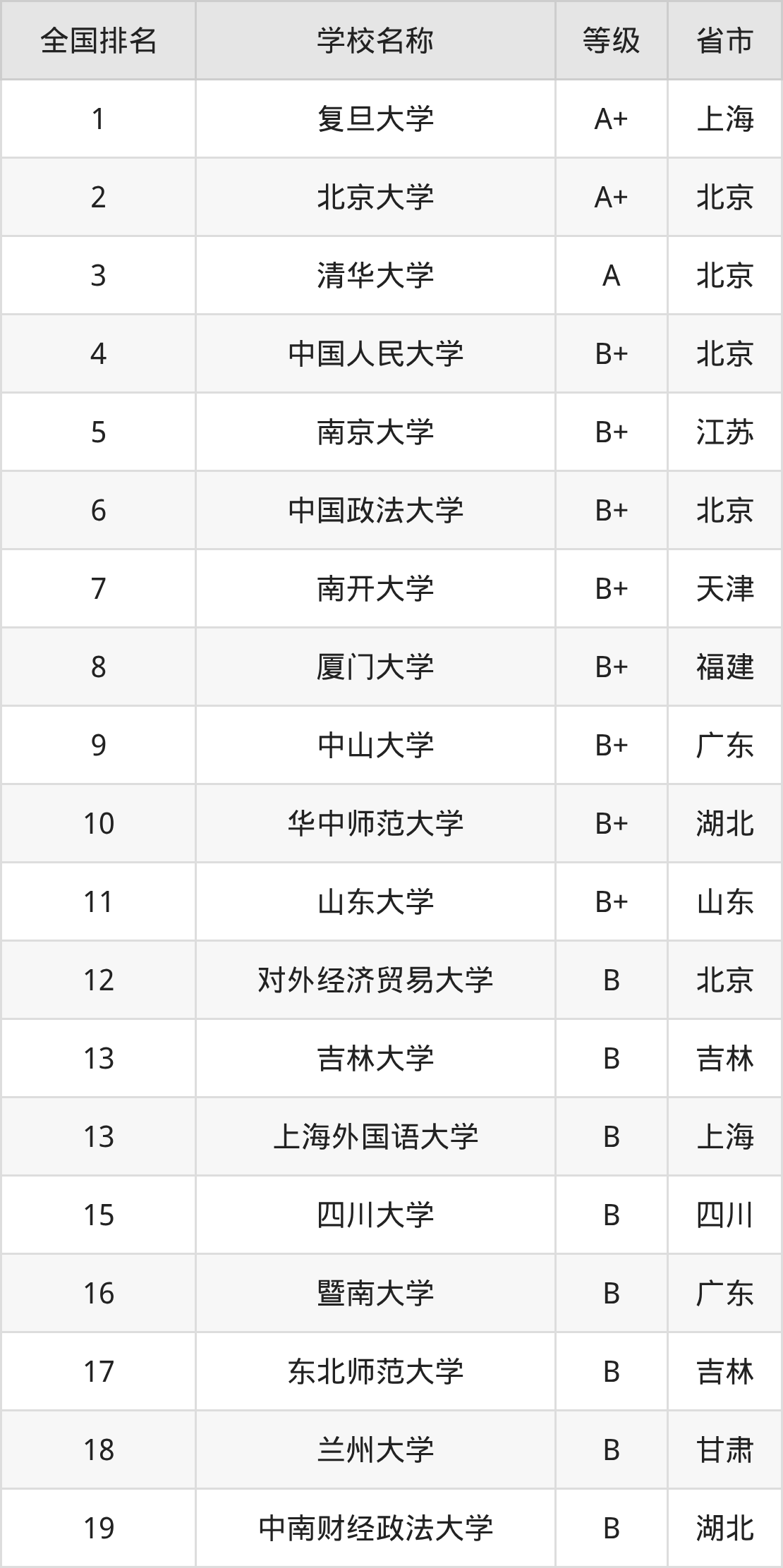 全国国际政治开设院校参与排名的共有19所,实力最强的是复旦大学(全国排名第1名),其专业实力等级被评为A+级。
