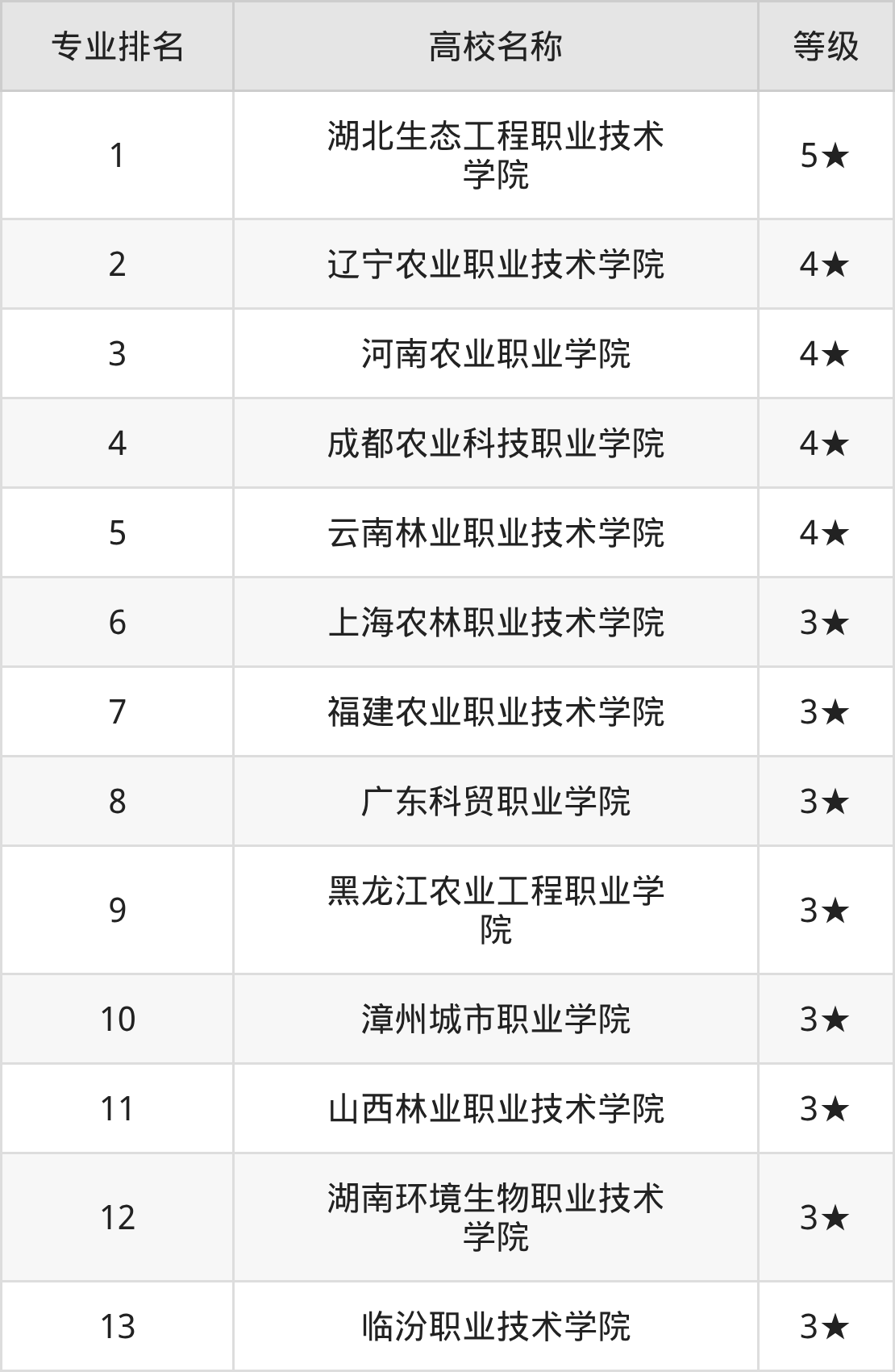 全国花卉生产与花艺开设院校参与排名的共有13所,实力最强的是湖北生态工程职业技术学院(全国排名第1名),其专业实力等级被评为5★级。