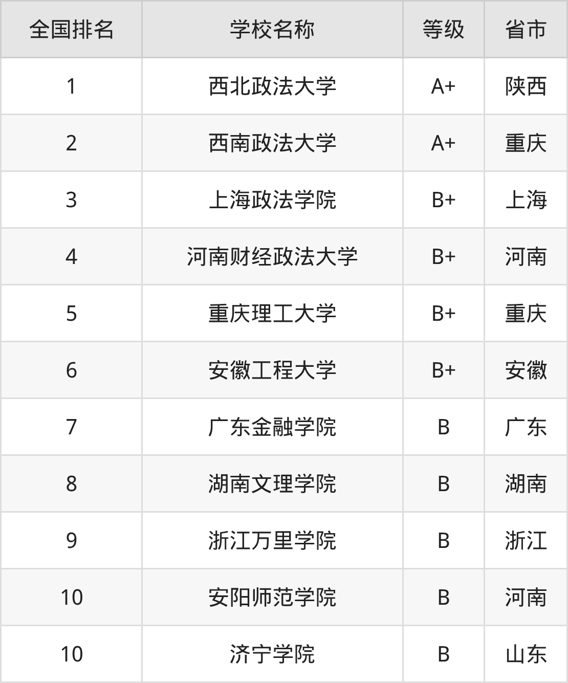 全国电子商务及法律开设院校参与排名的共有11所,实力最强的是西北政法大学(全国排名第1名),其专业实力等级被评为A+级。