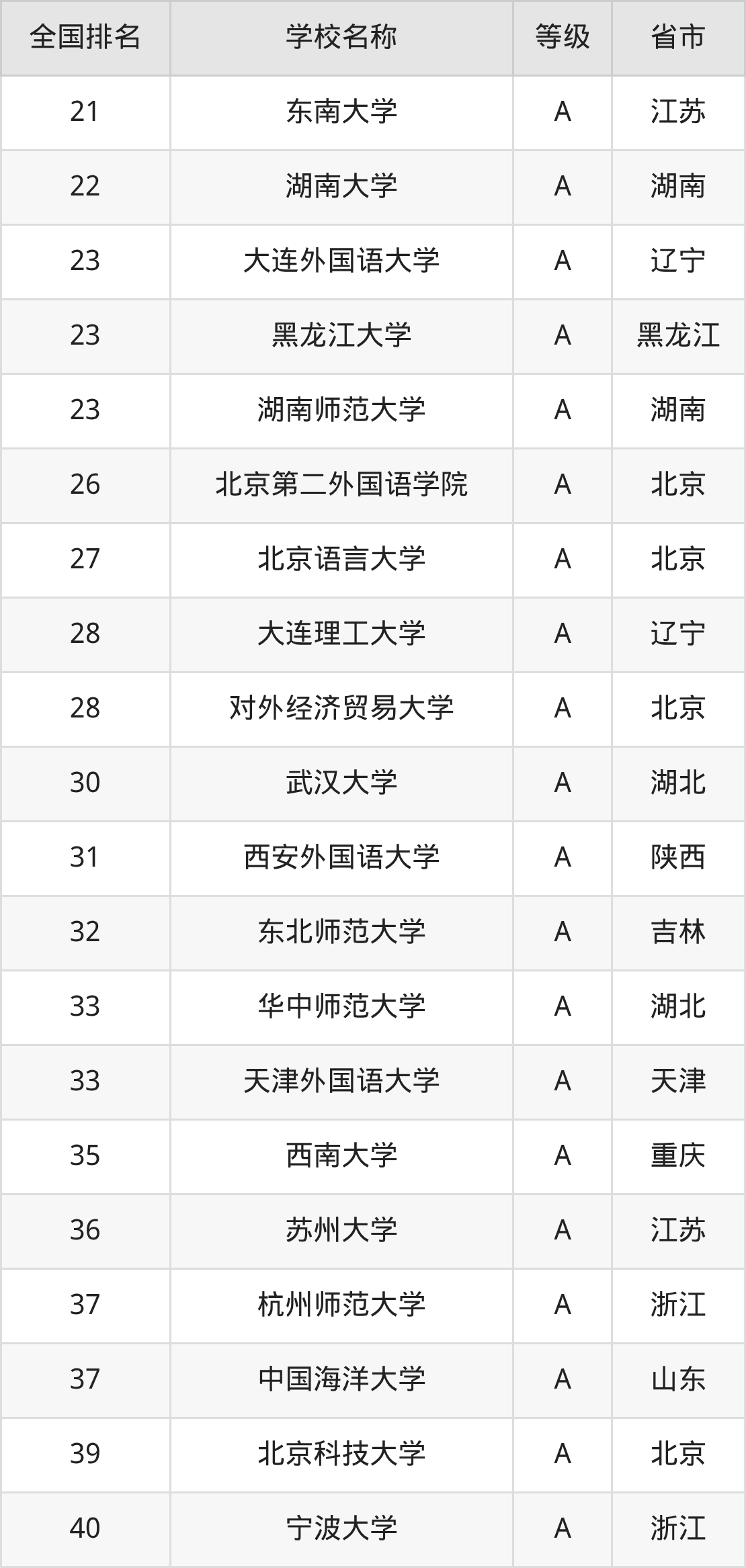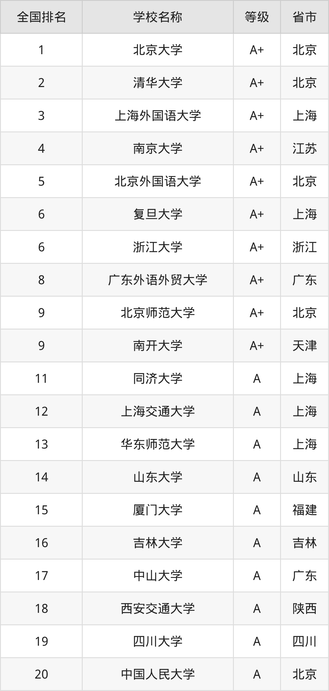 下面是日语专业全国排名前10的大学名单及实力评级: