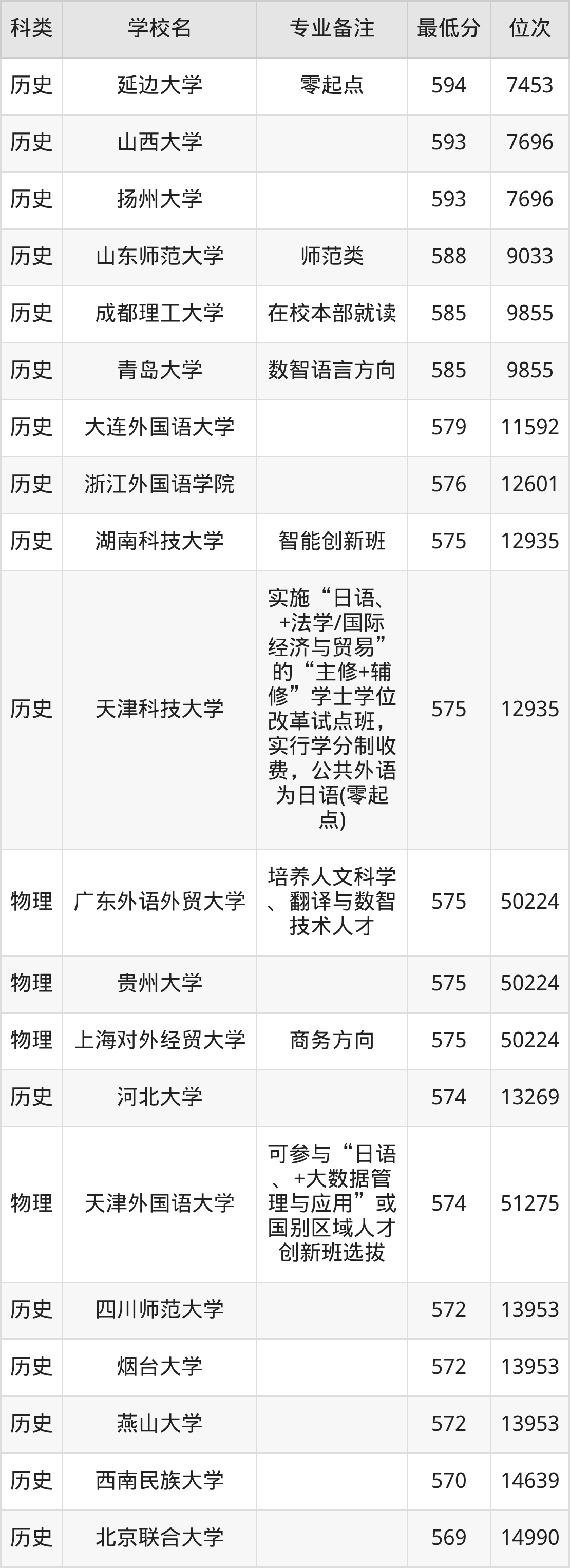 2025年全国大学日语录取分数线在431分~627分之间。数据显示,考生如果想报考公办大学,分数要在431分及以上,最低分院校有内蒙古大学(八协计划)等。