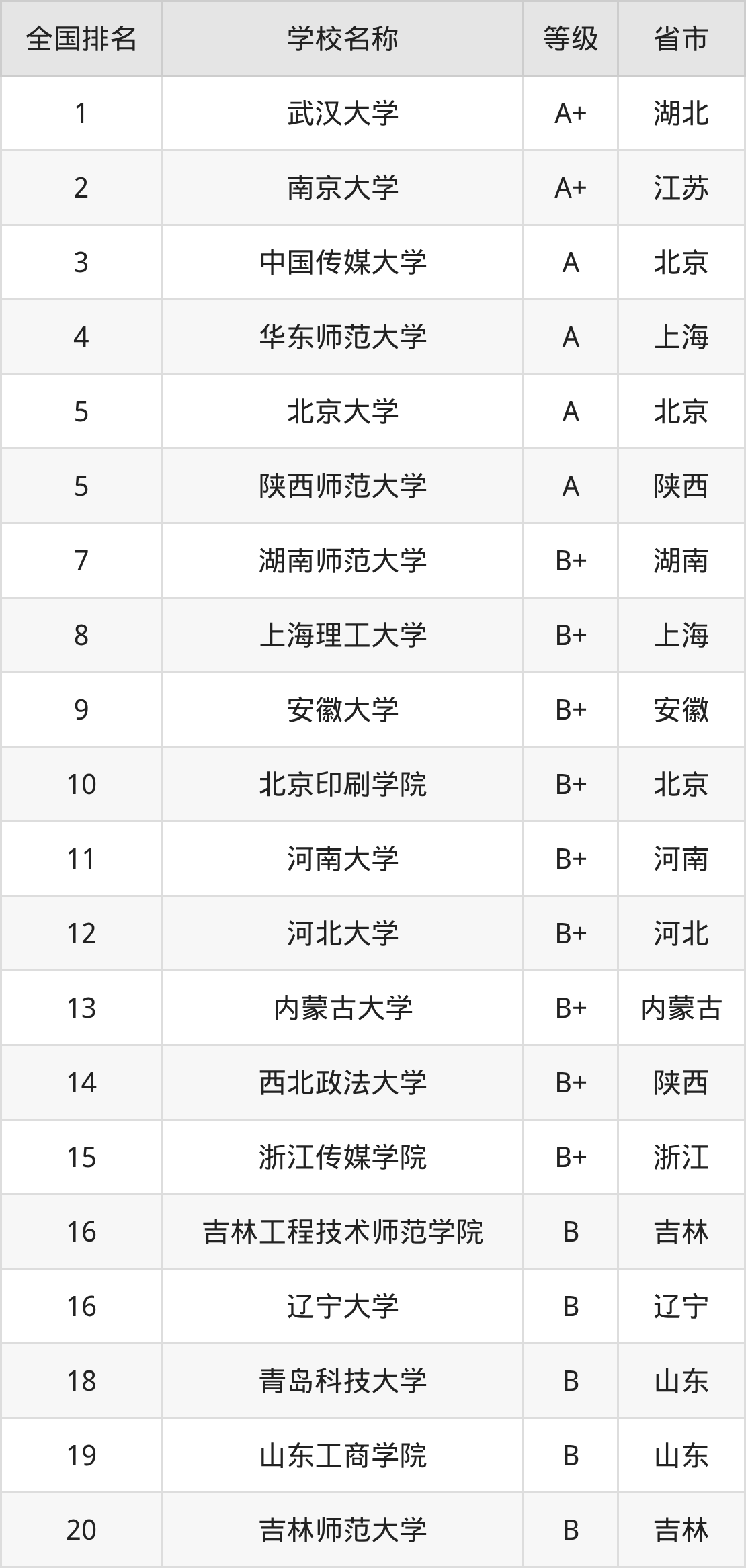 全国编辑出版学开设院校参与排名的共有25所,实力最强的是武汉大学(全国排名第1名),其专业实力等级被评为A+级。