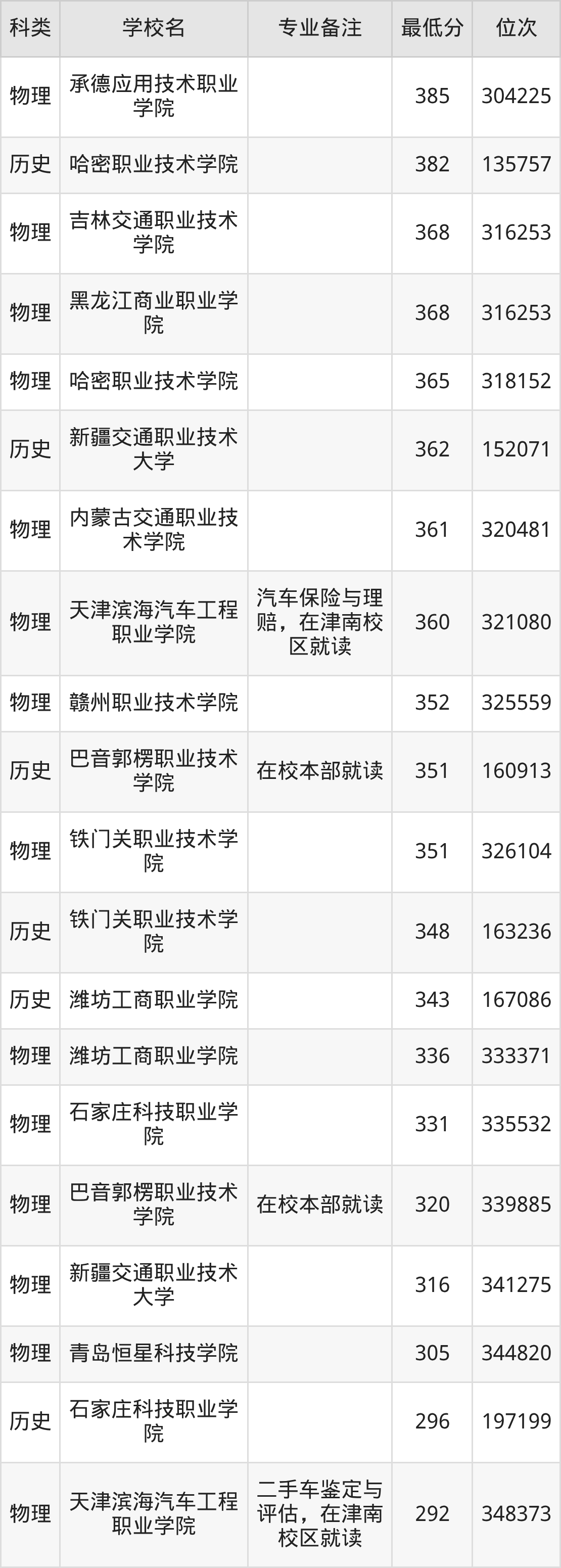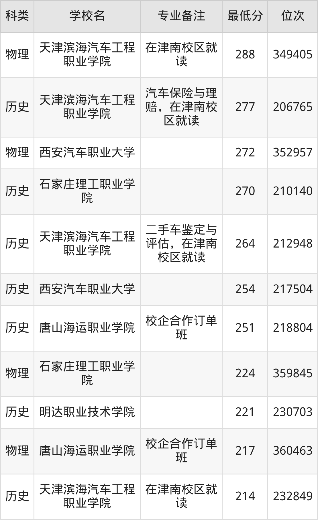 汽车技术服务与营销专业分数最低的民办大学是天津滨海汽车工程职业学院,其2025年最低分为214分,考生只要超专科线14分即有概率能被录取。