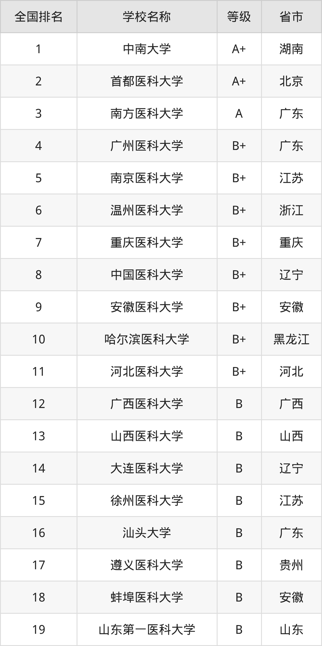 全国精神医学开设院校参与排名的共有19所,实力最强的是中南大学(全国排名第1名),其专业实力等级被评为A+级。