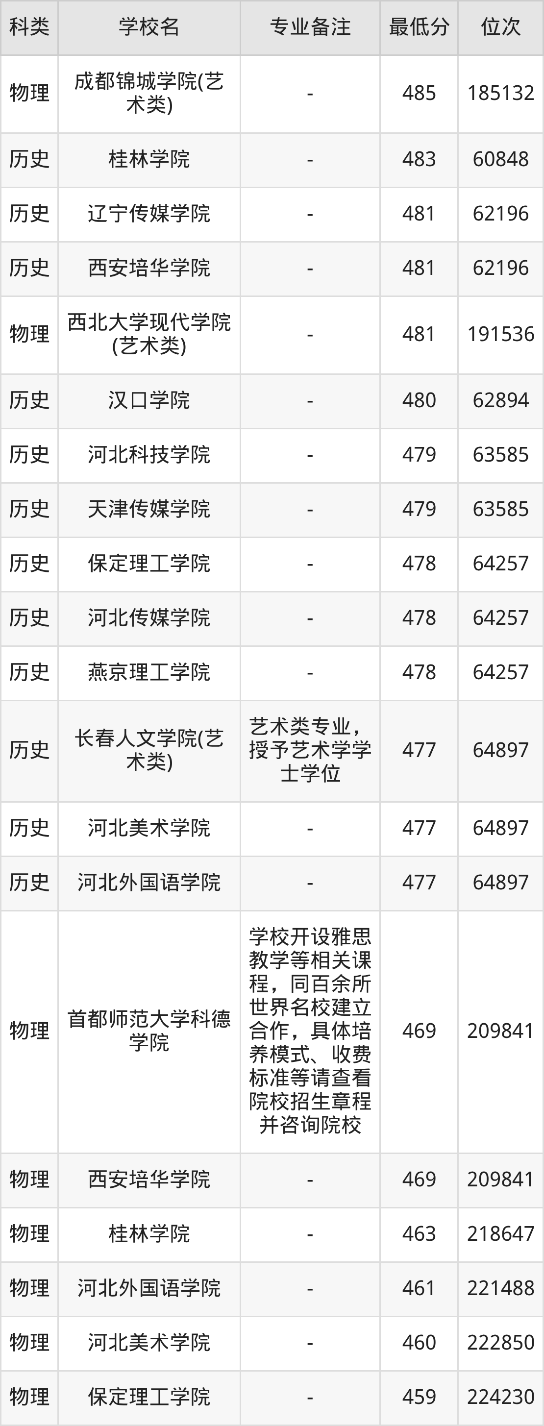 广播电视编导专业分数最低的民办大学是燕京理工学院、河北科技学院、河北传媒学院,其2025年最低分为459分,考生只要达到本科线即有概率能被录取。