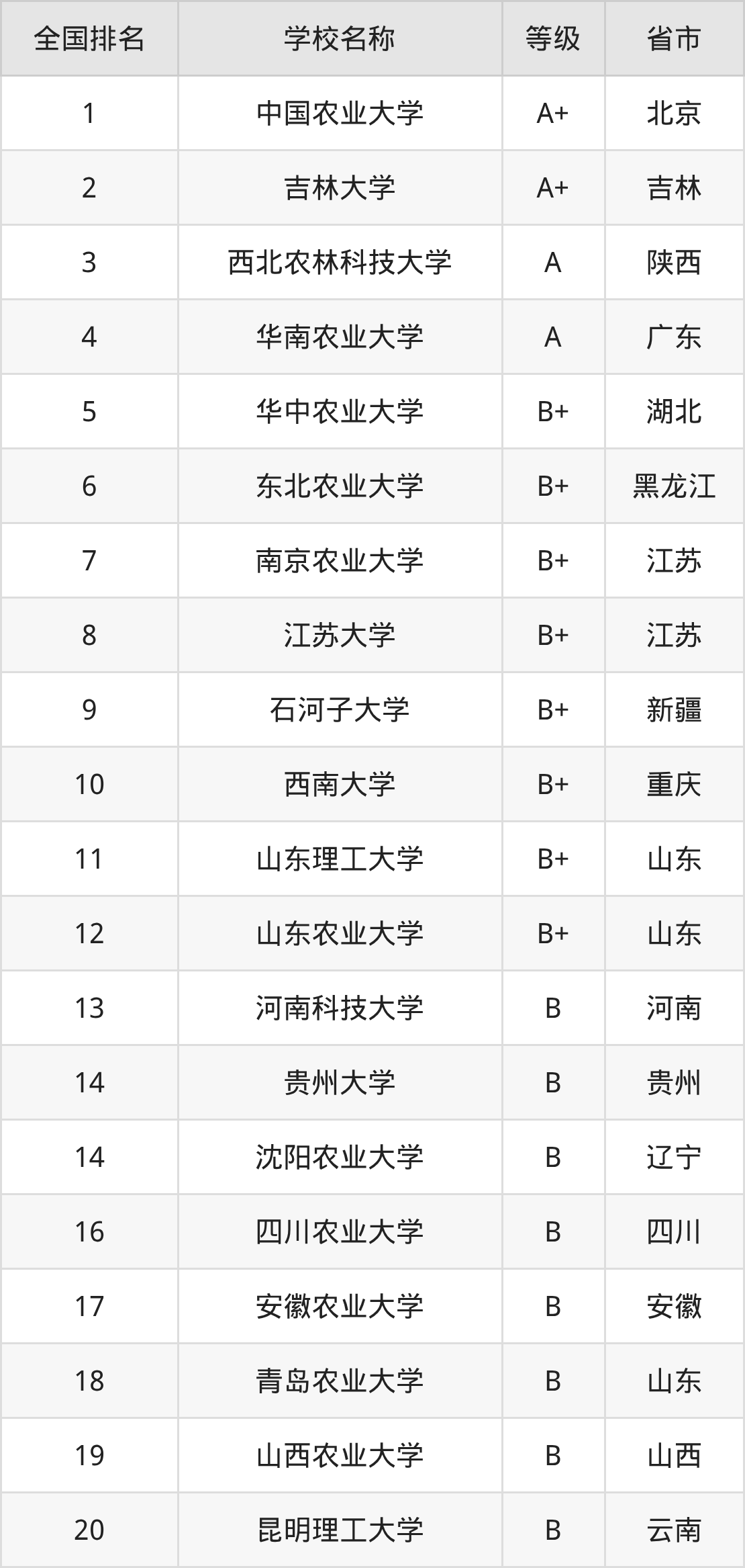 全国农业机械化及其自动化开设院校参与排名的共有20所,实力最强的是中国农业大学(全国排名第1名),其专业实力等级被评为A+级。