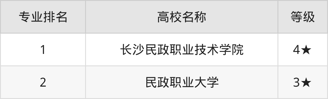 全国陵园服务与管理开设院校参与排名的共有2所,实力最强的是长沙民政职业技术学院(全国排名第1名),其专业实力等级被评为4★级。