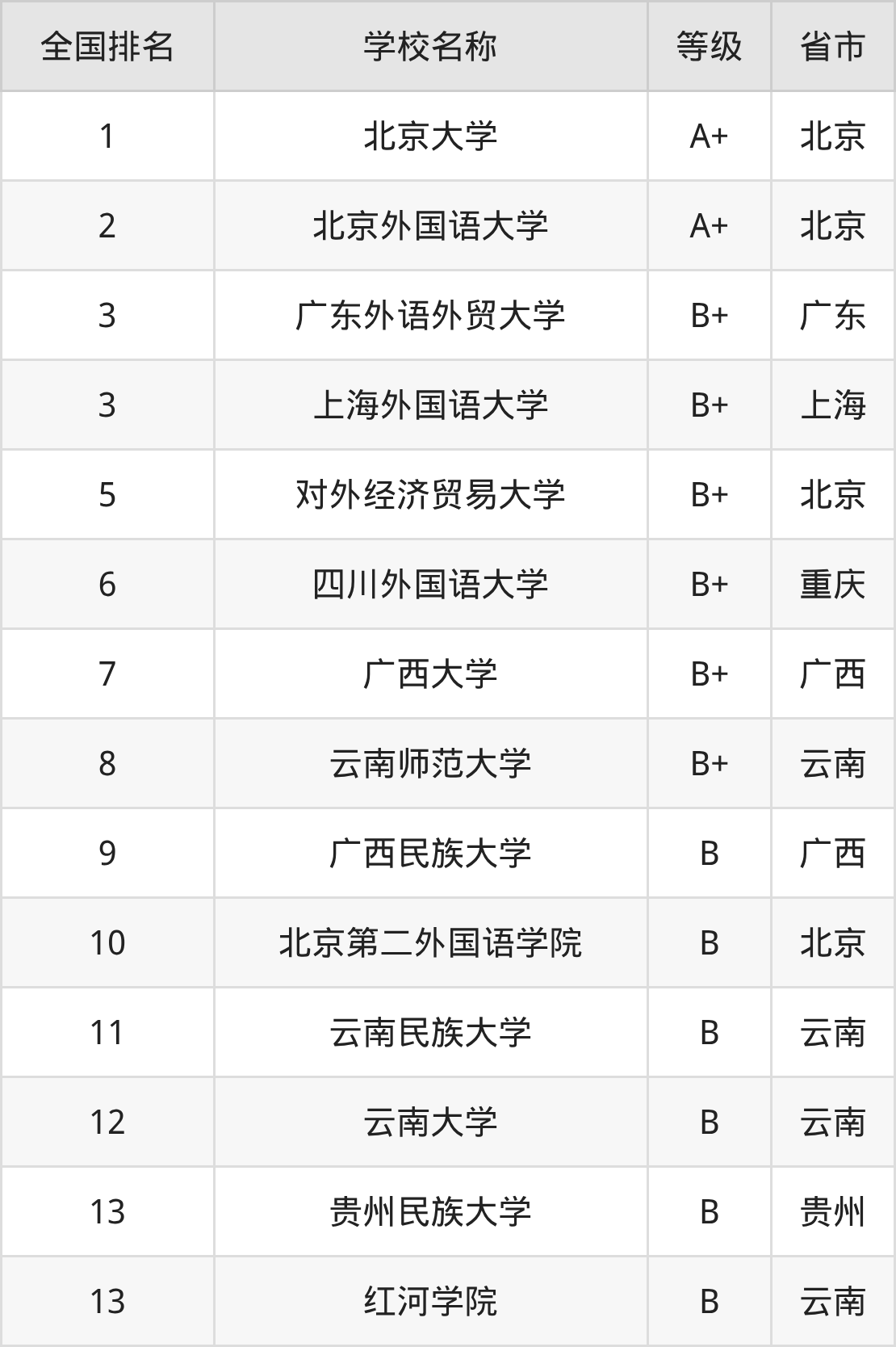 全国越南语开设院校参与排名的共有14所,实力最强的是北京大学(全国排名第1名),其专业实力等级被评为A+级。