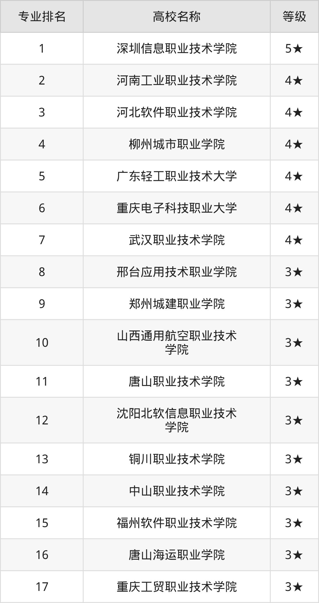 全国工业软件开发技术开设院校参与排名的共有17所,实力最强的是深圳信息职业技术学院(全国排名第1名),其专业实力等级被评为5★级。