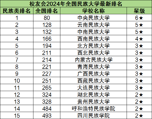 以下是校友会2024年全国民族大学最新排名一览表: