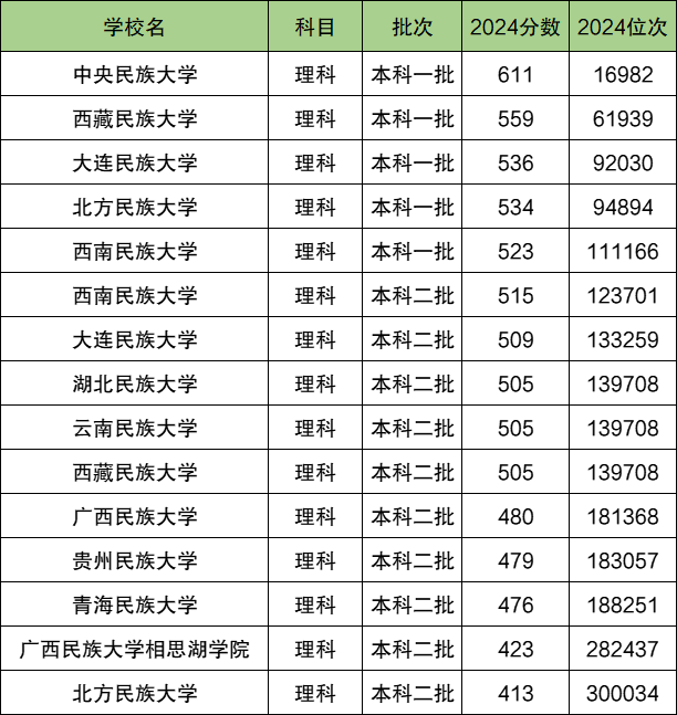 2024年全国民族大学在河南理科录取分数线排名一览表: