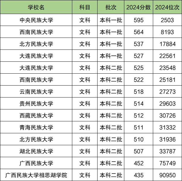 2024年全国民族大学在河南文科录取分数线排名一览表: