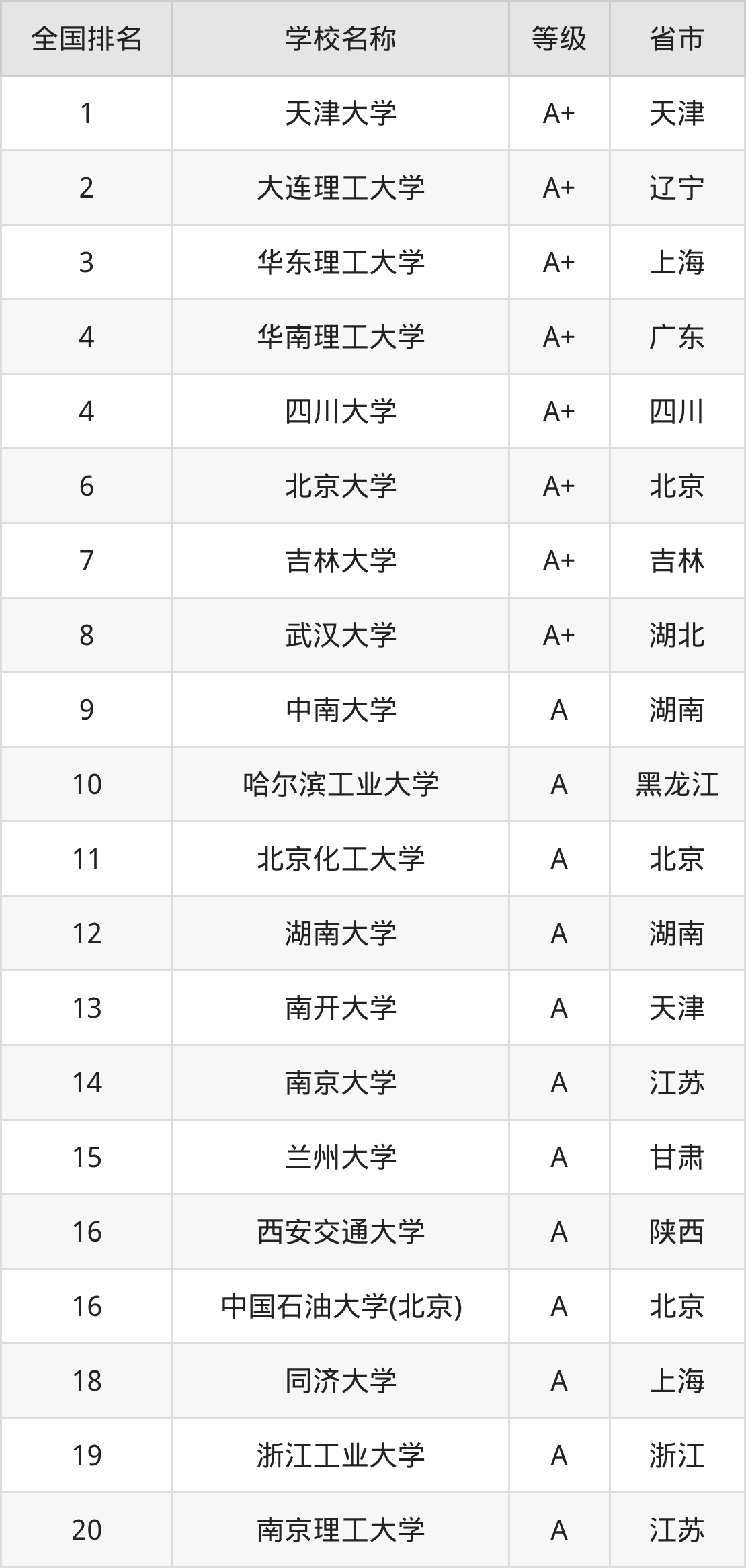 全国应用化学开设院校参与排名的共有211所,实力最强的是天津大学(全国排名第1名),其专业实力等级被评为A+级。