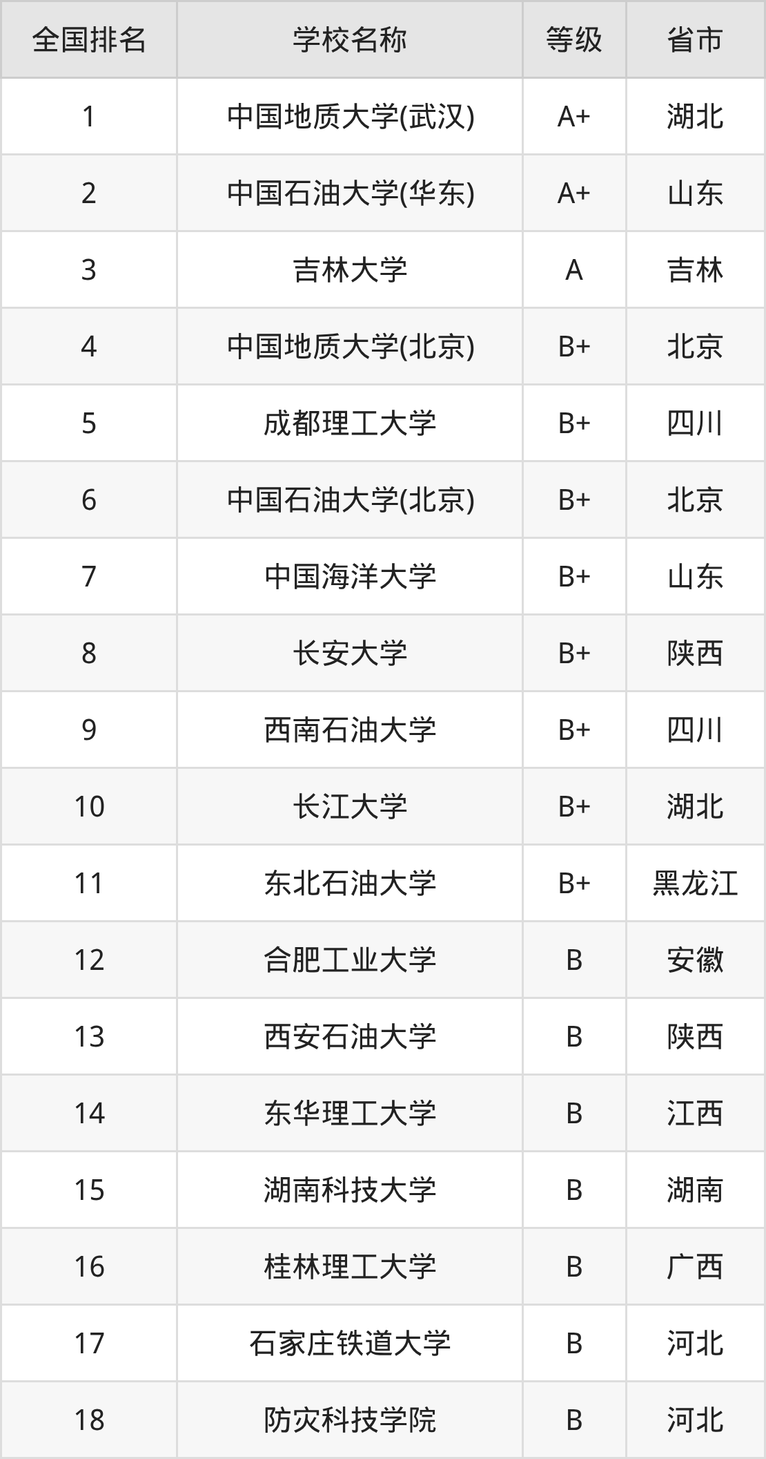 全国勘查技术与工程开设院校参与排名的共有18所,实力最强的是中国地质大学(武汉)(全国排名第1名),其专业实力等级被评为A+级。