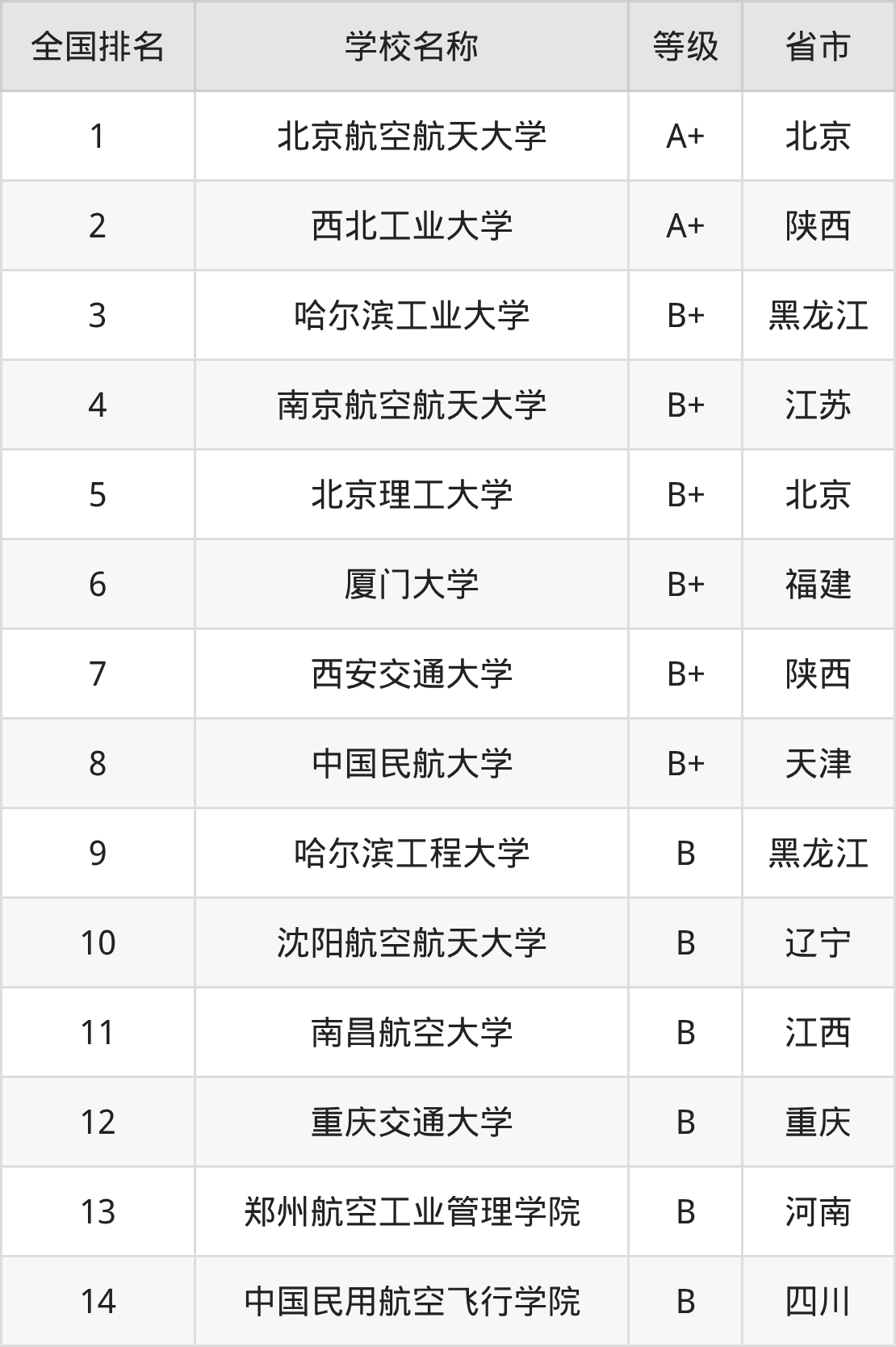 全国飞行器动力工程开设院校参与排名的共有14所,实力最强的是北京航空航天大学(全国排名第1名),其专业实力等级被评为A+级。