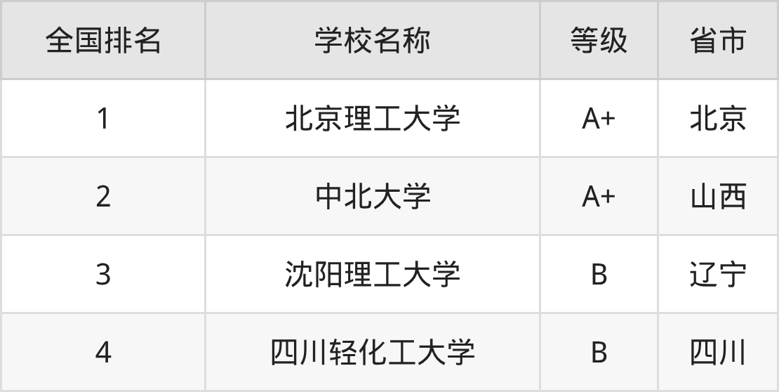 全国智能无人系统技术开设院校参与排名的共有4所,实力最强的是北京理工大学(全国排名第1名),其专业实力等级被评为A+级。