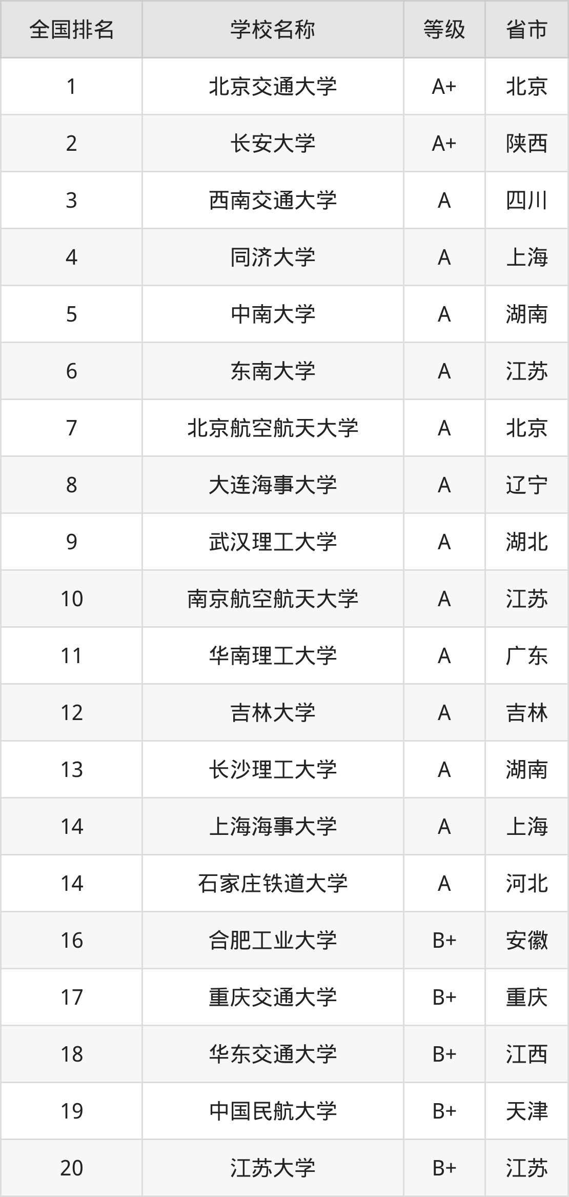 下面是交通运输专业全国排名前10的大学名单及实力评级: