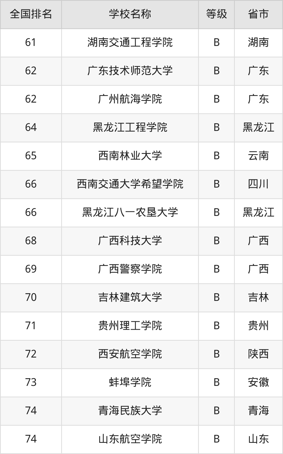全国交通运输开设院校参与排名的共有75所,实力最强的是北京交通大学(全国排名第1名),其专业实力等级被评为A+级。