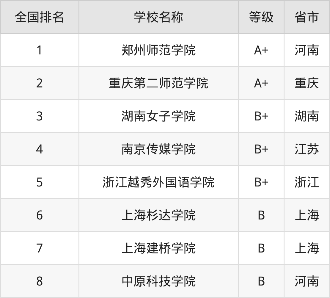 全国时尚传播开设院校参与排名的共有8所,实力最强的是郑州师范学院(全国排名第1名),其专业实力等级被评为A+级。