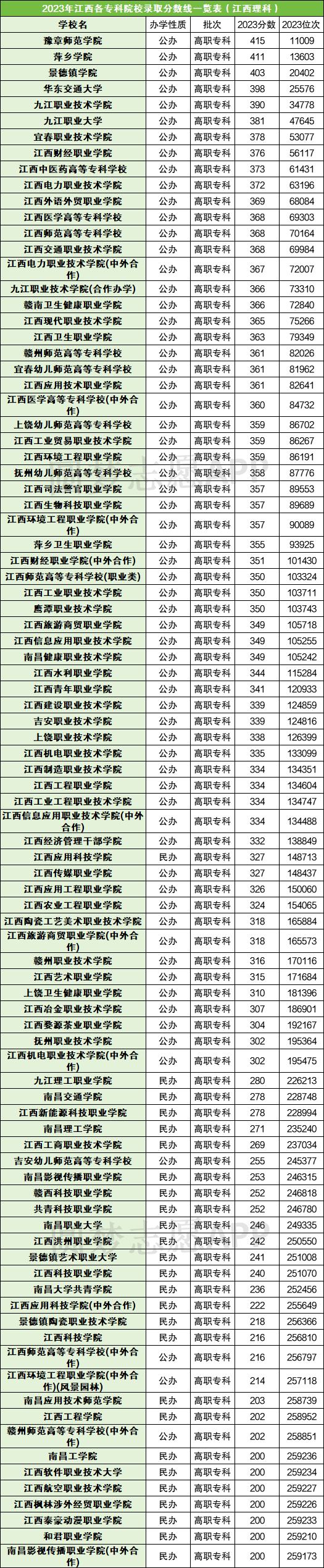 专科批次中的最高分院校是豫章师范学院,录取线是415分,位次是11009。专科院校的最低录取线是200分,在该分数的院校共有7所,包含和君职业学院、江西泰豪动漫职业学院、江西航空职业技术学院。