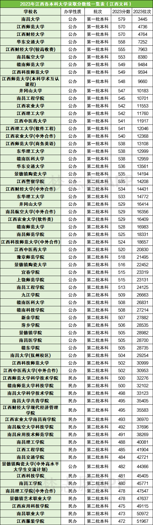 以江西2023年的招生数据为例,在理科方面,江西各本科大学的录取线在445-588分之间,位次在13087-131118之间;在文科方面,江西各本科大学的录取线在470-579分之间,位次在3445-51967之间。