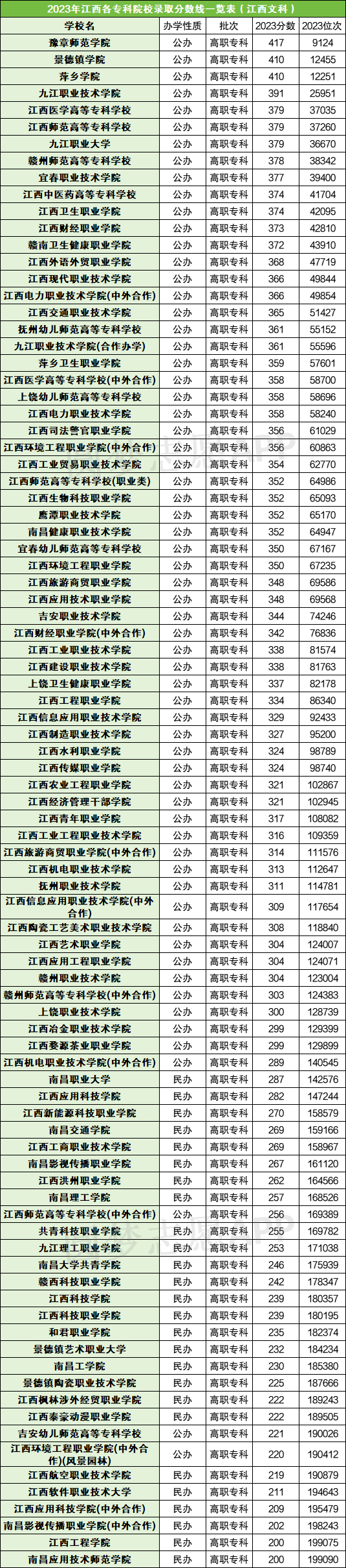专科批次中的最高分院校是豫章师范学院,录取线是417分,位次是9124。专科院校的最低录取线是200分,在该分数的院校有两所,分别是江西工程学院、南昌应用技术师范学院。