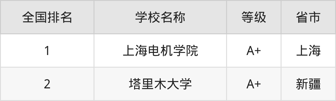全国电机电器智能化开设院校参与排名的共有2所,实力最强的是上海电机学院(全国排名第1名),其专业实力等级被评为A+级。