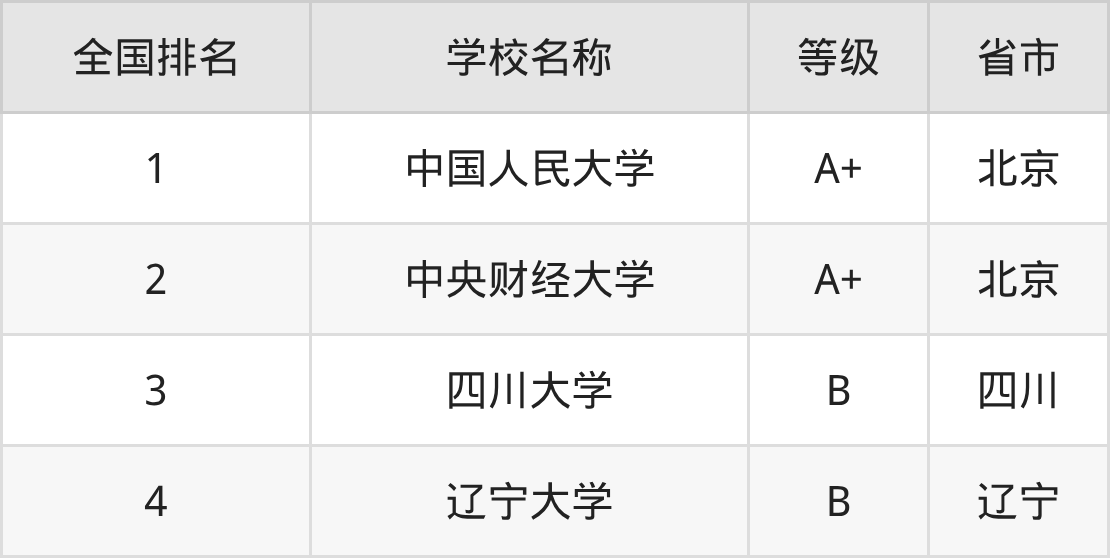 下面是国民经济管理专业全国排名前4的大学名单及实力评级: