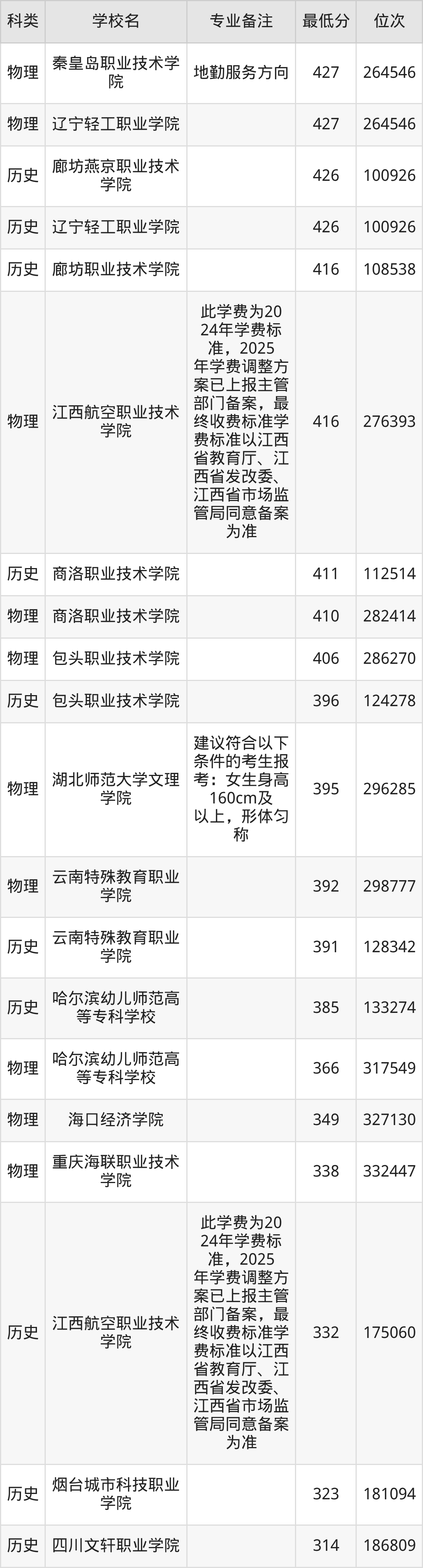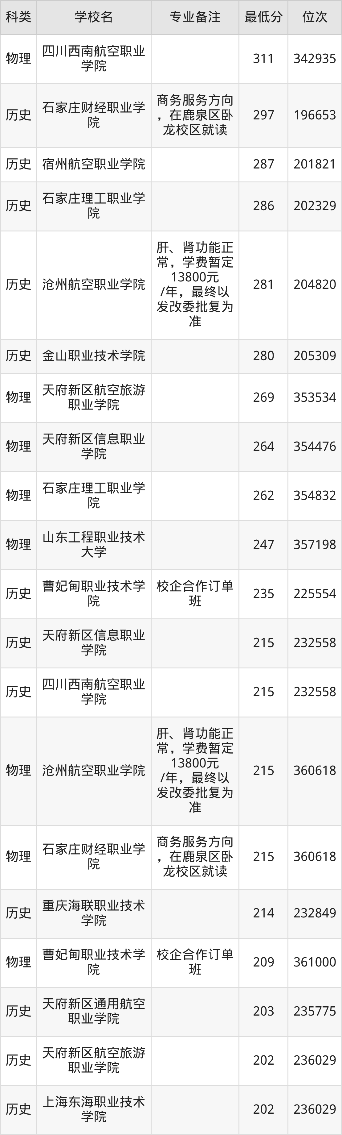 民航运输服务专业分数最低的民办大学是上海东海职业技术学院、天府新区航空旅游职业学院,其2025年最低分为202分,考生只要超专科线2分即有概率能被录取。