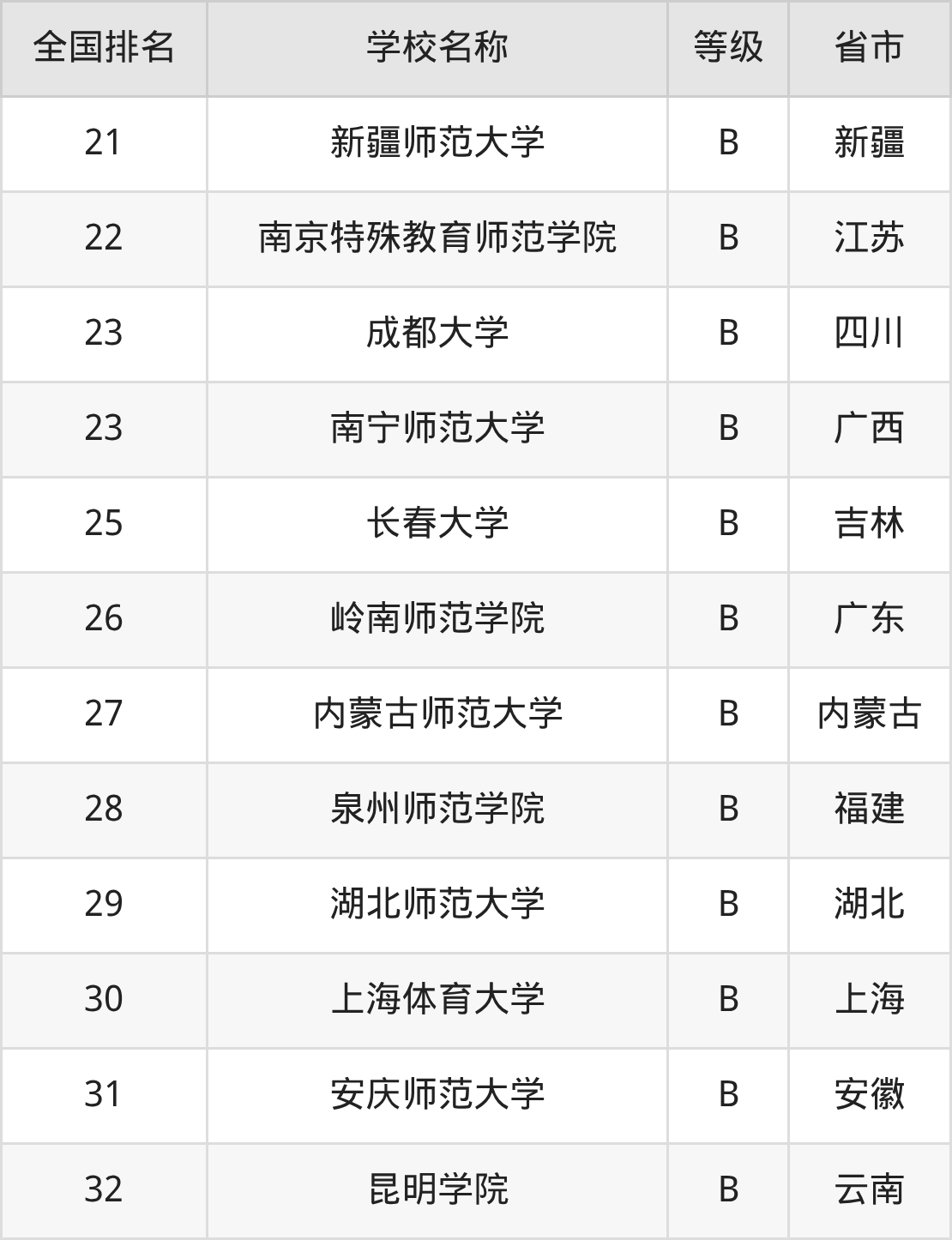 全国特殊教育开设院校参与排名的共有32所,实力最强的是华东师范大学(全国排名第1名),其专业实力等级被评为A+级。