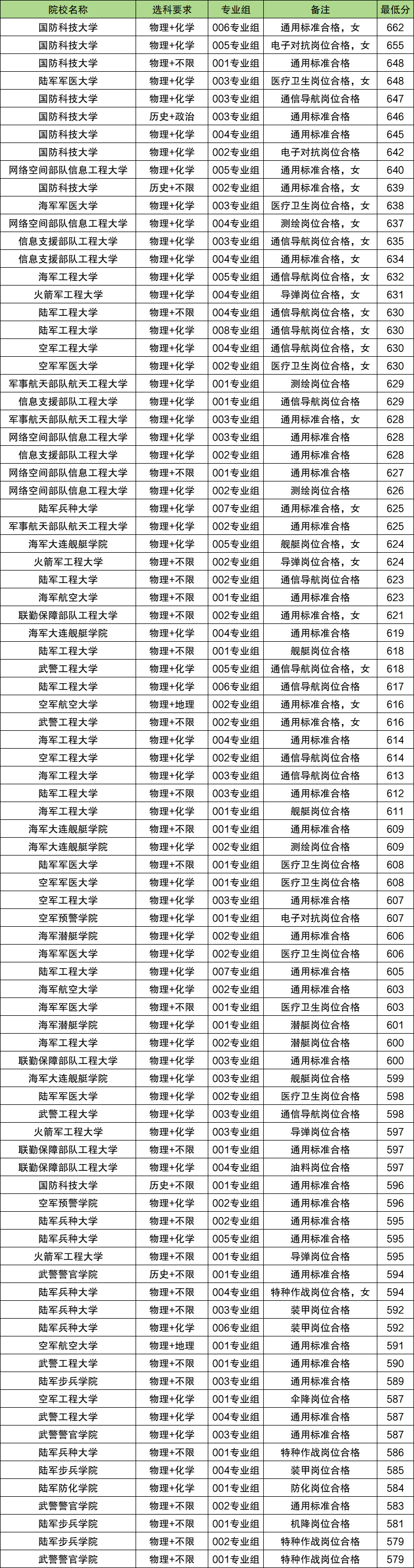 2025年军校录取分数线区间是579分到662分,收分最低的军校为陆军步兵学院002专业组和武警警官学院001专业组,专业要求为特种作战岗位合格。收分最高的军校是国防科技大学,对应的是006专业组(通用标准合格、女)。