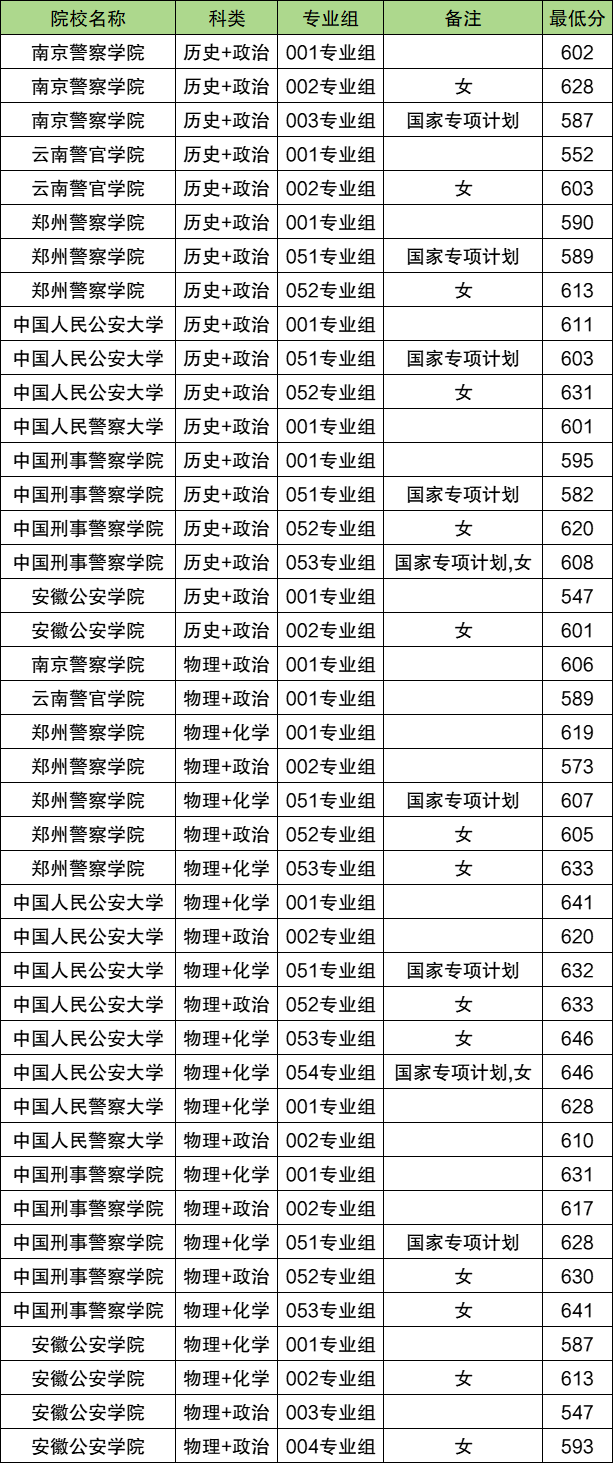 2025年警校录取分数线区间是547分到646分,收分最低的警校为安徽公安学院,对应的是001专业组(历史类)、003专业组(物理类)。收分最高的军校是中国人民公安大学,对应的是054专业组和053组。