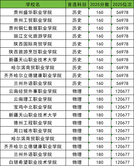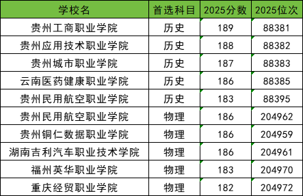 2025年贵州历史类民办专科最低录取分数线是183分,收分最低的大学有贵州民用航空职业学院;物理类民办专科最低分是182分,收分最低的大学是重庆经贸职业学院。