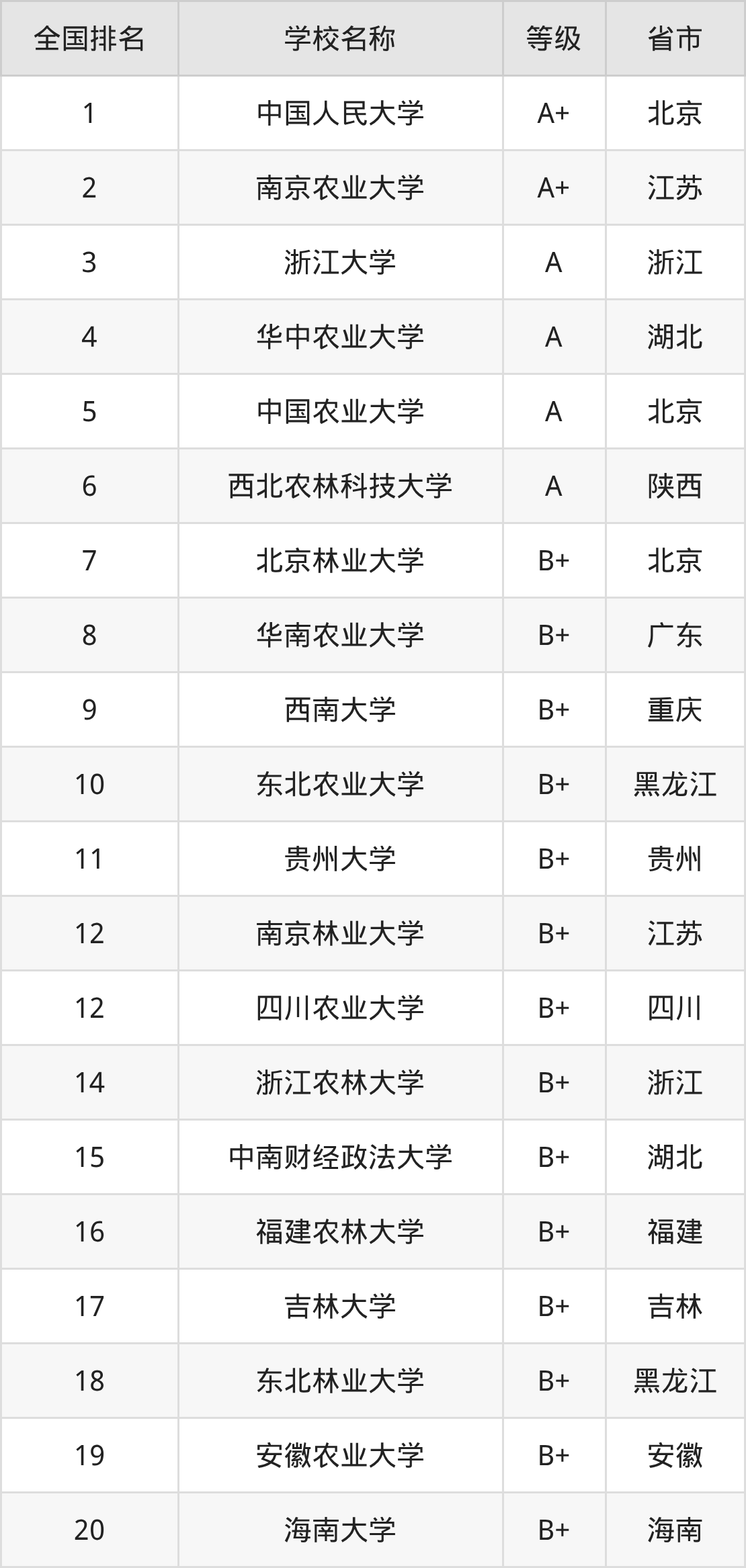 下面是农林经济管理专业全国排名前10的大学名单及实力评级: