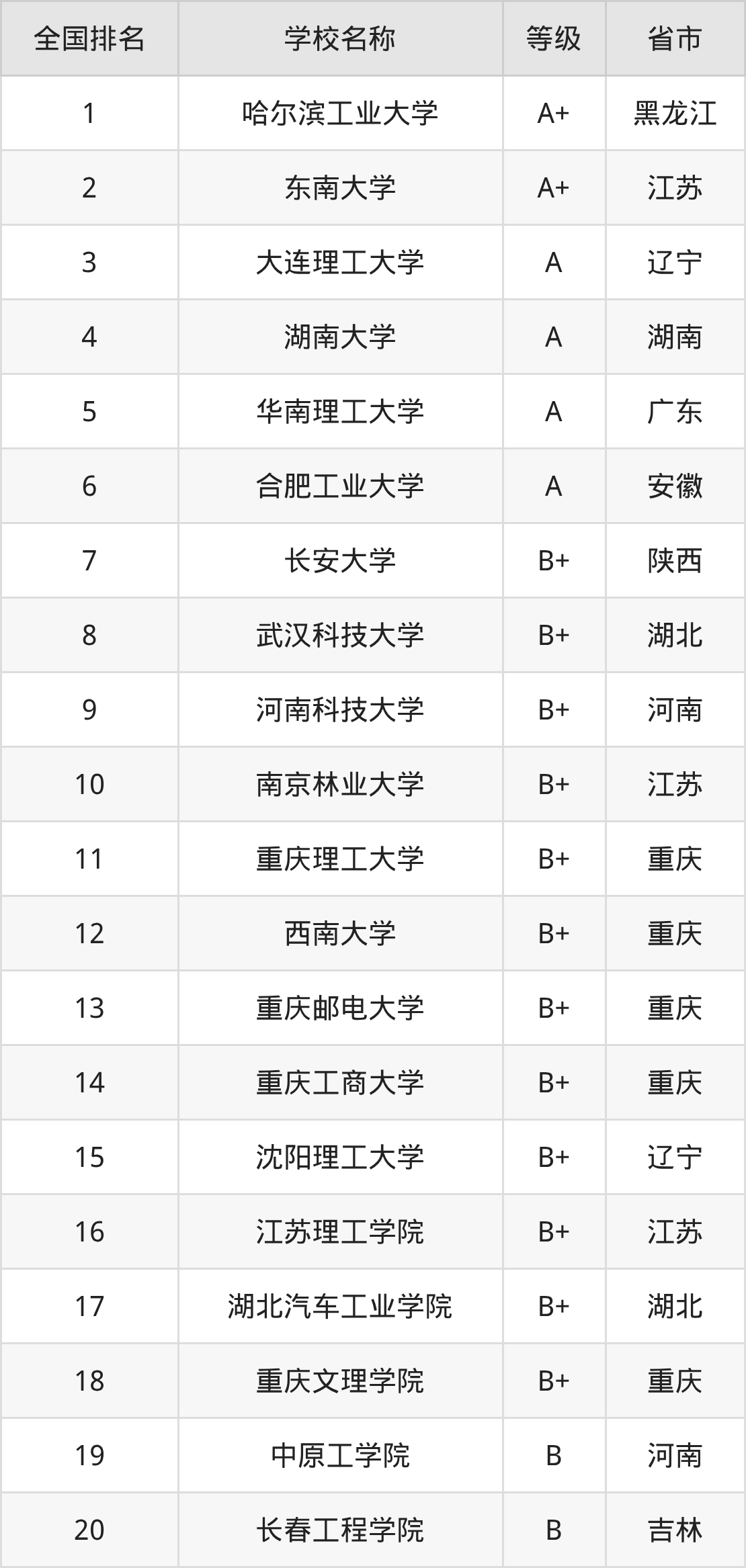 全国智能车辆工程开设院校参与排名的共有32所,实力最强的是哈尔滨工业大学(全国排名第1名),其专业实力等级被评为A+级。