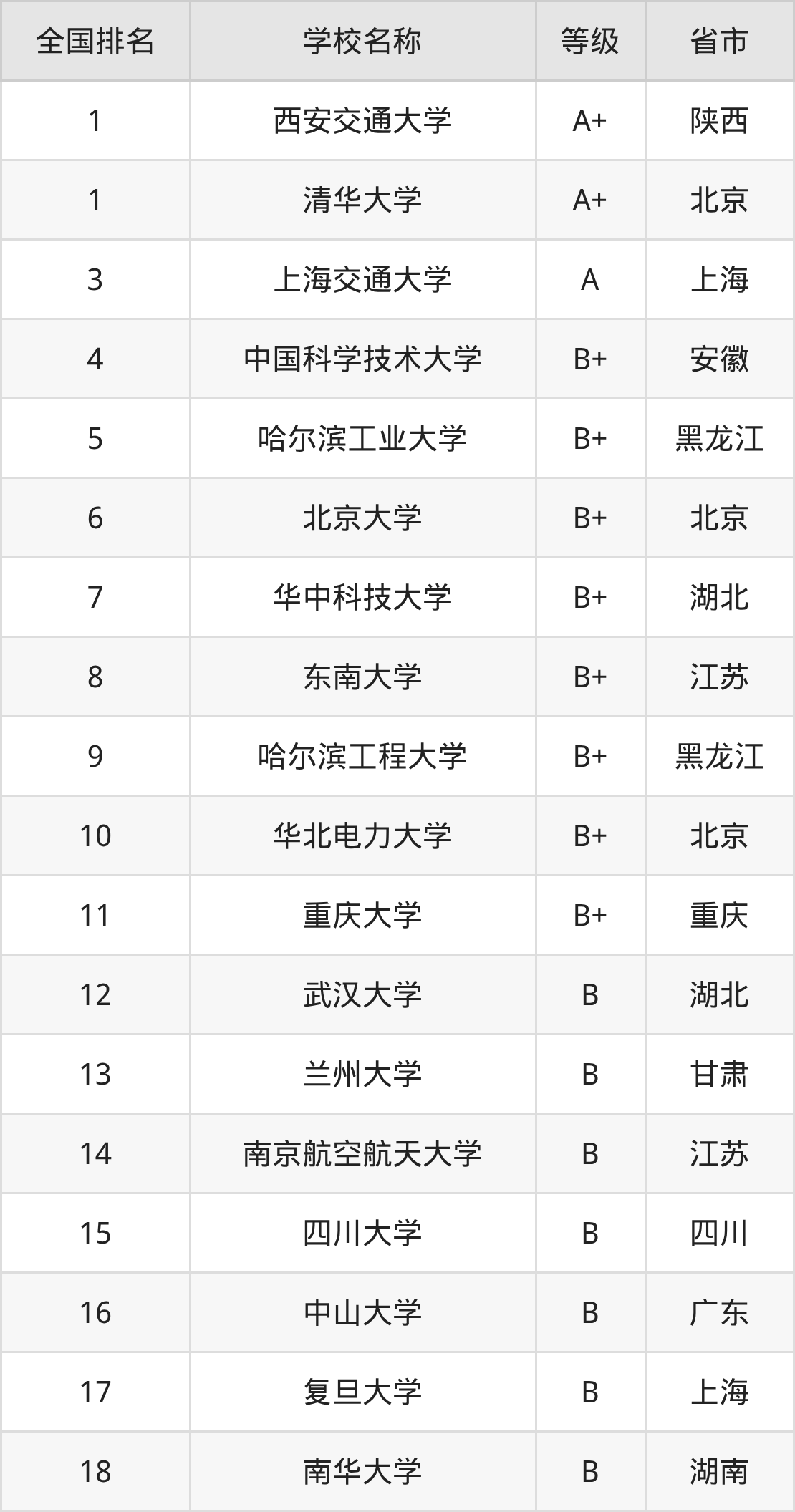 全国核工程与核技术开设院校参与排名的共有18所,实力最强的是西安交通大学(全国排名第1名),其专业实力等级被评为A+级。