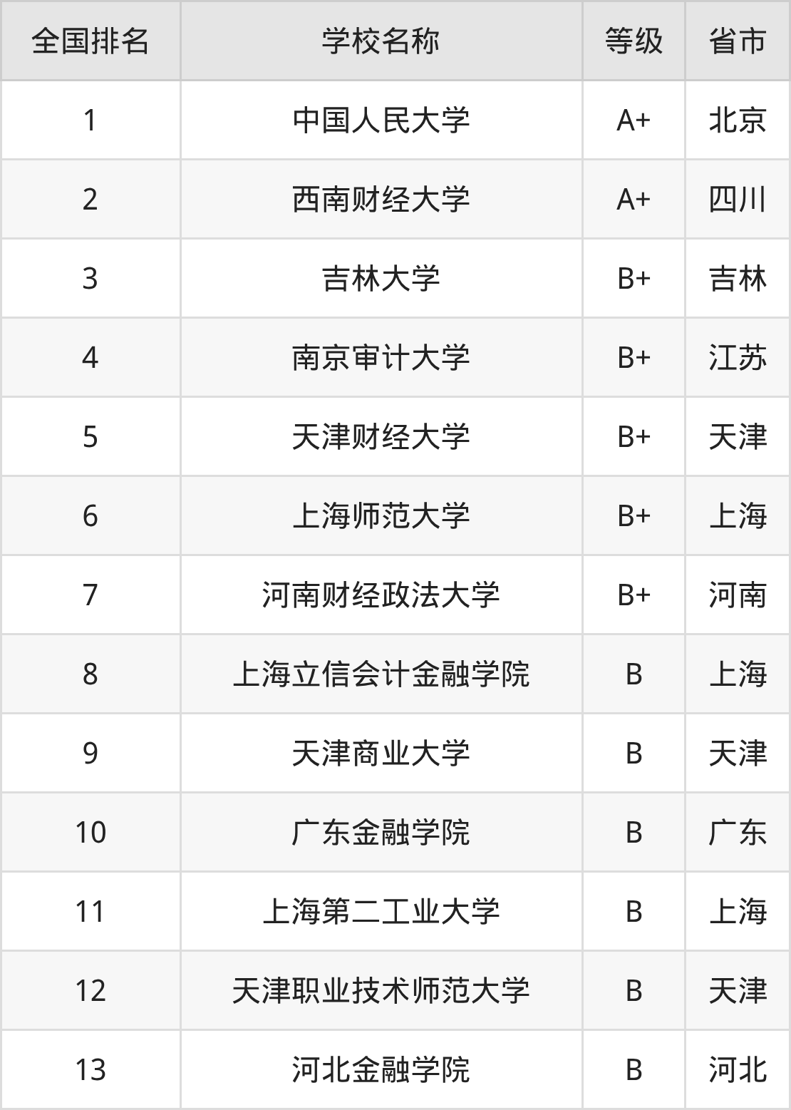 全国信用管理开设院校参与排名的共有13所,实力最强的是中国人民大学(全国排名第1名),其专业实力等级被评为A+级。
