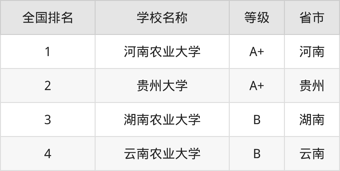 全国烟草开设院校参与排名的共有4所,实力最强的是河南农业大学(全国排名第1名),其专业实力等级被评为A+级。