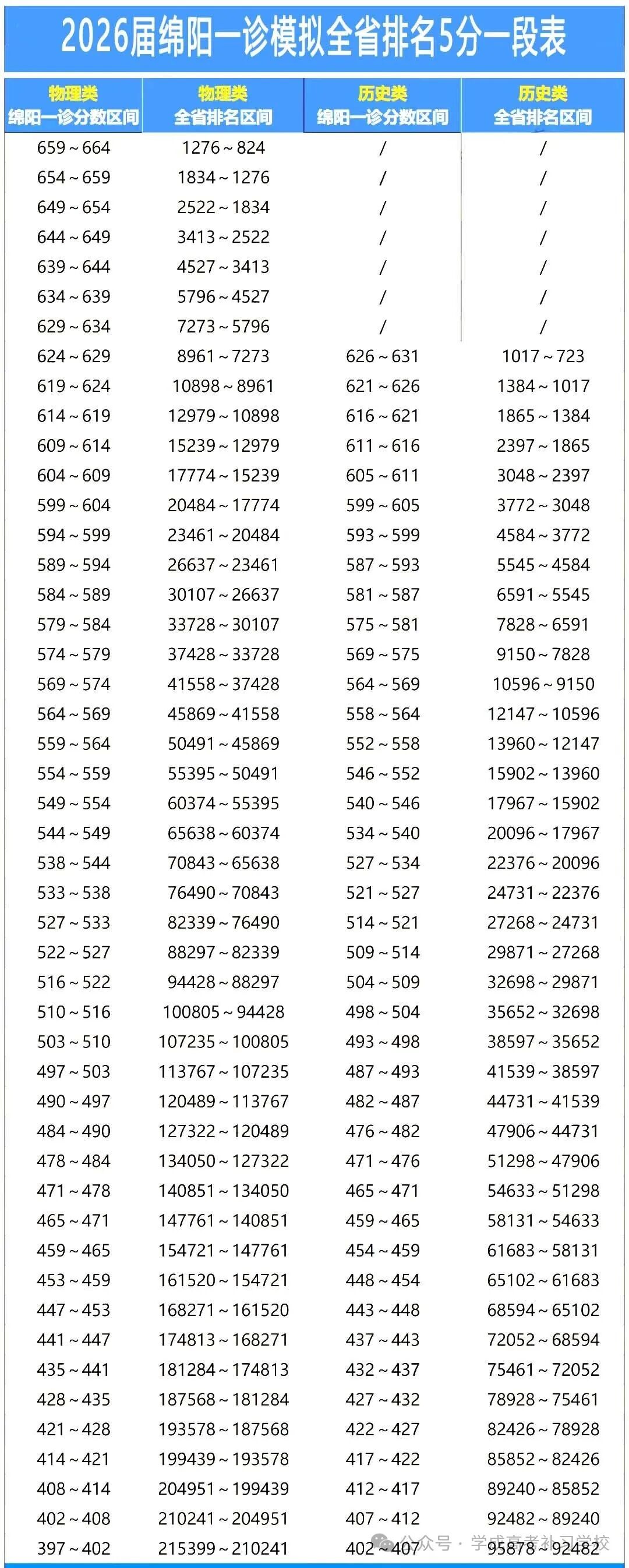 2026年绵阳一诊物理类:659分到664分对应全省排名区间是1276名到824名;619分到624分对应全省排名区间是10898到8961名。