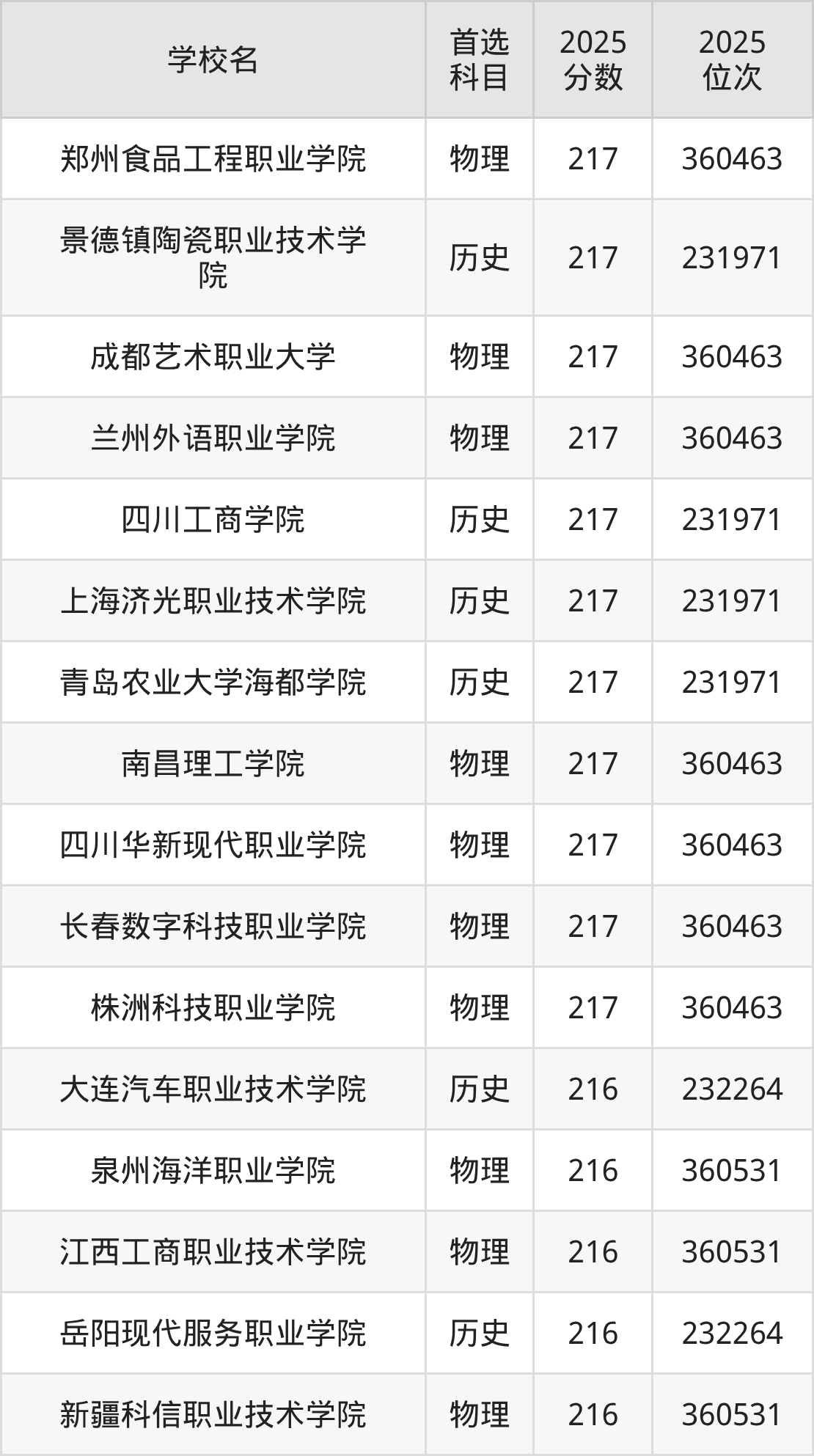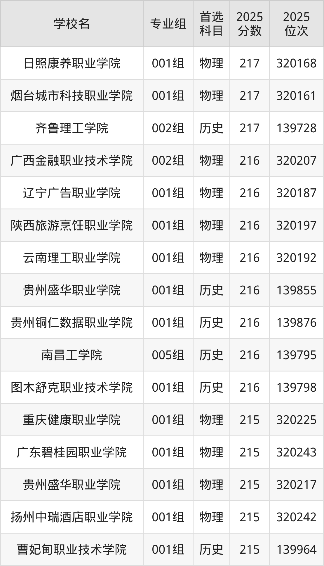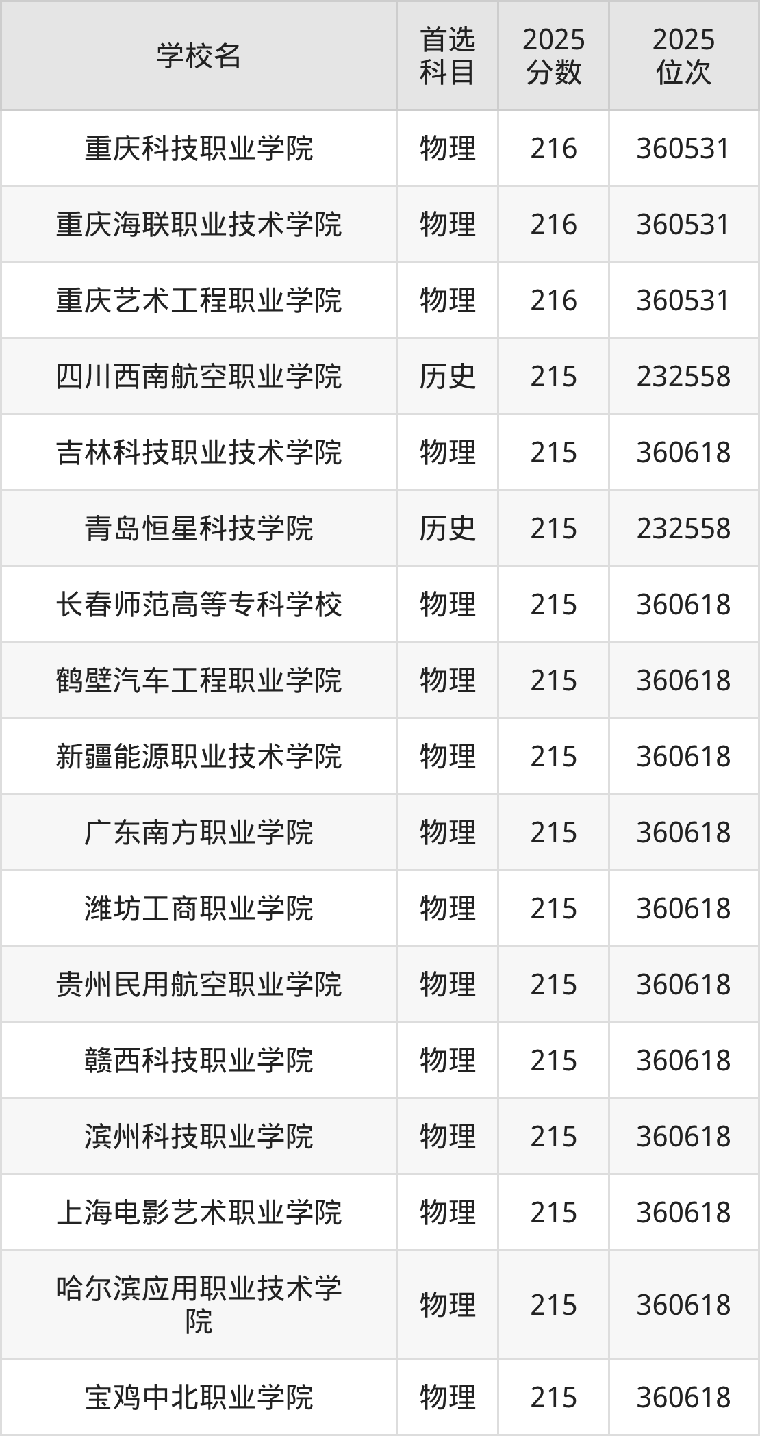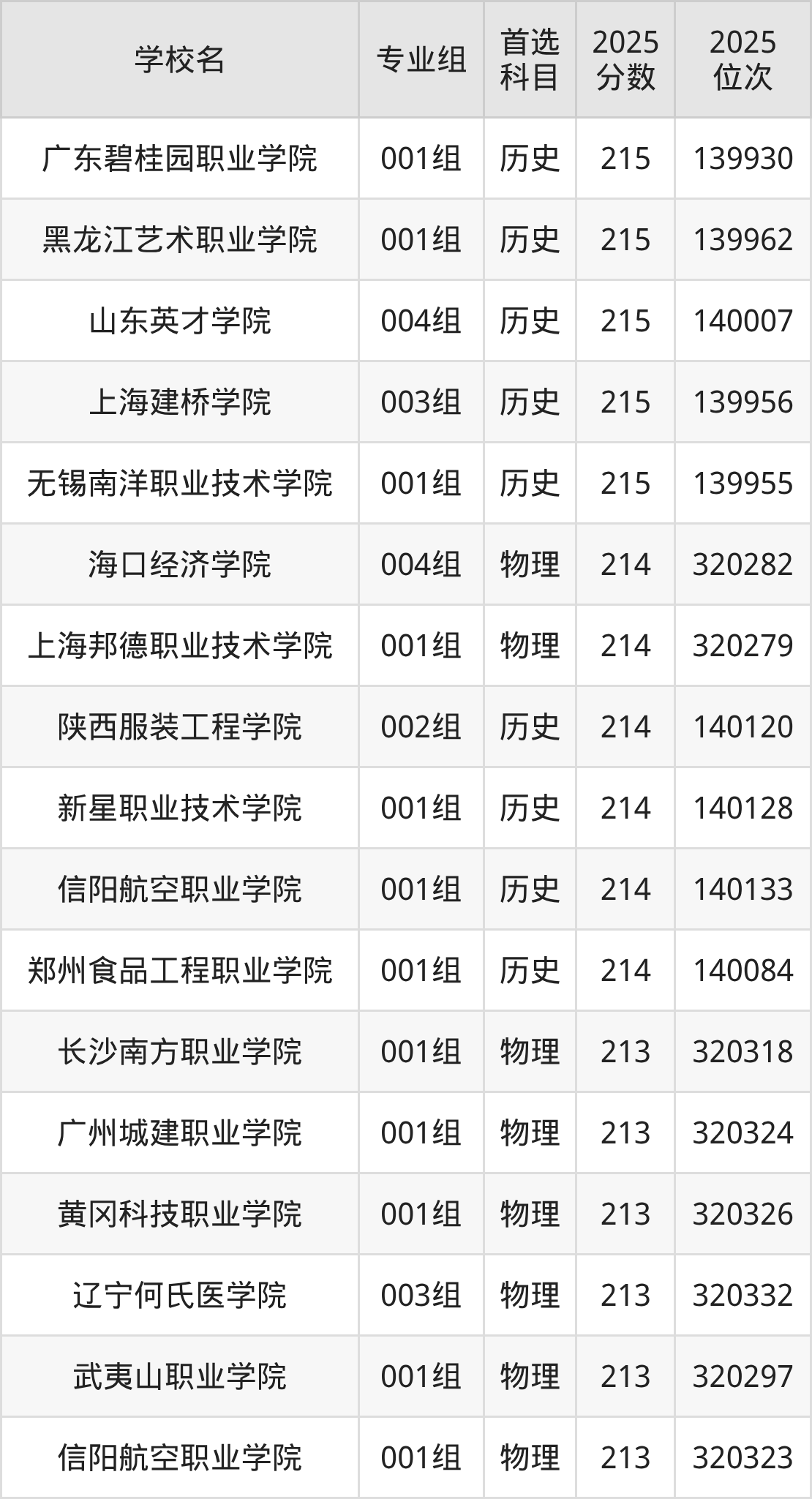 下面老师将以上文整理的其中两个省份为例,为大家具体展示215分左右能上的专科大学名单。