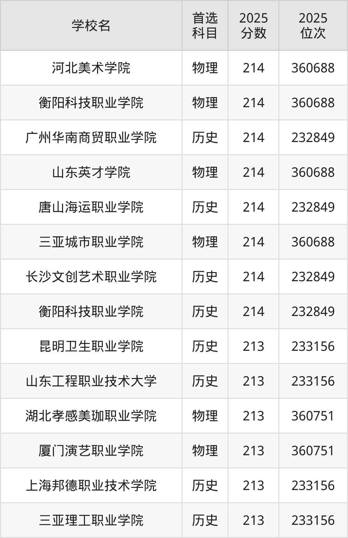 2025年在河北高考历史类录取分数线是215分的大学有四川西南航空职业学院、青岛恒星科技学院。物理类录取分数线是215分的大学有吉林科技职业技术学院、长春师范高等专科学校、鹤壁汽车工程职业学院、新疆能源职业技术学院、广东南方职业学院、潍坊工商职业学院、贵州民用航空职业学院、赣西科技职业学院、滨州科技职业学院、上海电影艺术职业学院等。
