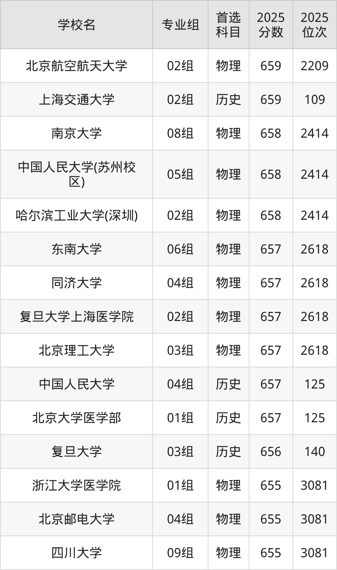 物理类657分可以冲的大学:北京航空航天大学659分、南京大学658分、中国人民大学(苏州校区)658分、哈尔滨工业大学(深圳)658分等;较稳妥的大学:浙江大学医学院655分、北京邮电大学655分、四川大学655分。